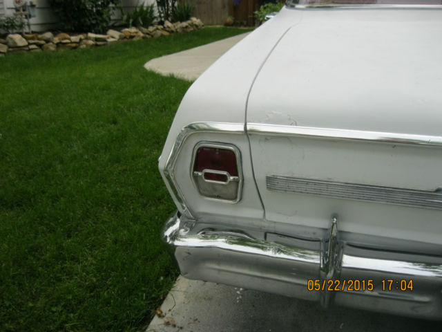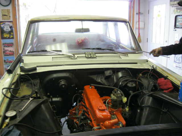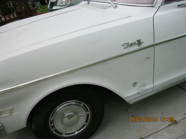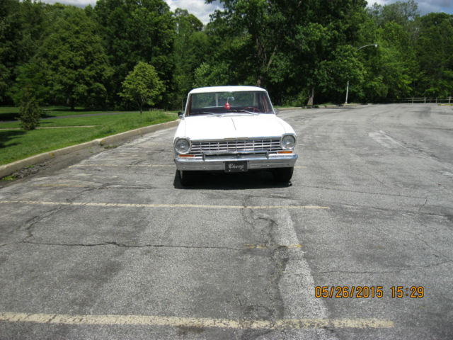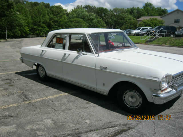 1964 Chevy II Nova. White with red interior. Engine is a rebuilt 194 6 inline. Engine has 100 miles on rebuild. Transmission is rebuilt has 100 miles on rebuild. The transmission is a air cooled automatic. It has power steering power brakes. The car has new radiator new belts and hoses. New fuel filter new fuel lines new starter new master cylinder new carburetor total rebuild under the hood. New total exhaust new fuel tank and straps new brakes new tires. This car has the original jack and spare. The body needs minor work and the interior is original faded but in good shape no cuts or rips. ALL NUMBERS MATCH. I bought this car as a project for my brother and I and he has since passed away so we did not have time to complete the body. The car went to a couple of car shows as a "work in progress". I will not transfer the title until the money clears my bank. Buyer is responsible for delivery shipping etc.