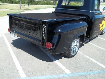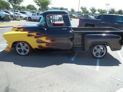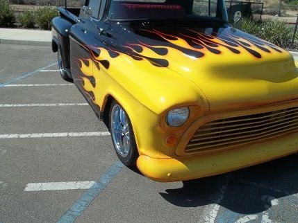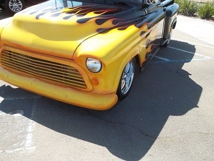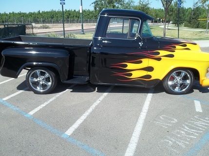 THE 1956 IS TITLE AS A 1956 GMC PICK UPWITH A 1957 CHEVY FRONT AND BEDTHE HOOD IS A 1955-56.THE MOTOR IS A 350 TRANS IS A 350 AUTOHAS A CAMARO FRONT CLIP BOXED TO THEORINAIL GMC FRAME WITH DISC BRAKES AND POWER STEERINGBRAKES.THE REAR END IS A CAMARO WITH DRUM BRAKES.THE 56 HAS FLOW MASTER.THE RED INTEROIR IS NEW WITH NEW DOOR HANDLES WINDOW CRANKS DOOR HANDLESNEW OUTSIDE DOOR HANDLE MIRRIORS.THE INSIDE IS PAINTED SATIN BLACK WITH NEW CHROME COLUNMNEW HALF WRAP STEERING WHEELBILLET GAUGE CLUSTER WITH DOLPHIN.THE CAB IS PANITED GLOSS HOT ROD BLACK THE FLAMES WERE A BASE COAT SPRAYED WITH A CLEAR COAT.THE 56 HAS NEW DELUXE CAB MOLDINGSNEW WINDSHIELD AND RUBBERNEW DOOR TO CAB SEALSTHE RIM OR BOSS MOTOR SPORTS 338 CHROME 17X8 WITH NEW TIRES 235-45-17 DESPOSIT OF US $1000 WITHIN 48 HRS OF AUCTION CLOSE.FULL PAYMENT REQUIRED WITHIN 7 DAYS OFAUCTION CLOSE 1-559-679-1270 |