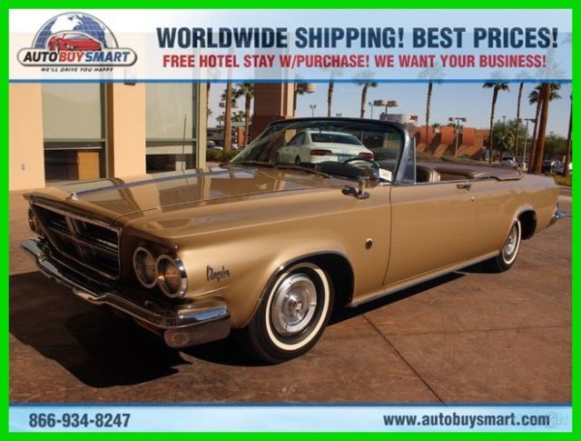| This is one of only 625 Chrysler 300K convertibles built. It is special-order Champagne Metallic and one of 24 convertibles with factory air conditioning. It is equipped with its original 413 Wedge V8 engine with 360 horsepower. This is a beautiful example of an original California car with 47,000 original miles, ileage not indicated on title. It comes equipped with power windows, ower bucket seats, ir conditioning, -speed automatic transmission, ach and power top. |