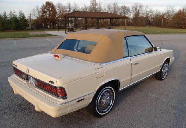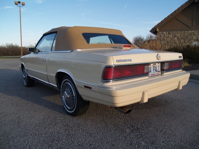1986 LeBaron (Mark Cross Edition) 2.2 Turbo Charged engine. This car is a survivor. It has never been restored. Less than 62,000 miles. Original paint, nterior and convertible top. For the last 11 years it was only driven on Sunny days. LeBaron originally came from California. 2.2 Turbo Charged EngineAir conditioning (Converted to 134A freon)Power steeringPower brakesElectric door locksTilt wheelCruise controlPower windowsAM/FM Cassette radioPower leather seatsDigital DashRemote outside mirrorsWire wheel hubcaps Original LeBaron's in this condition are getting very hard to find. You will not be disappointed with this beautiful car. This car looks like a new one that has been in a time capsule since 1986. Seller discloser: There is only a small amount of wear in the interior of this car. Also, he right rear window will not go up or down. The window motor is good on the right rear window. I believe the nylon track belt is broken. This is a rust free car. |