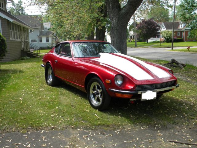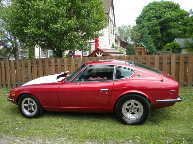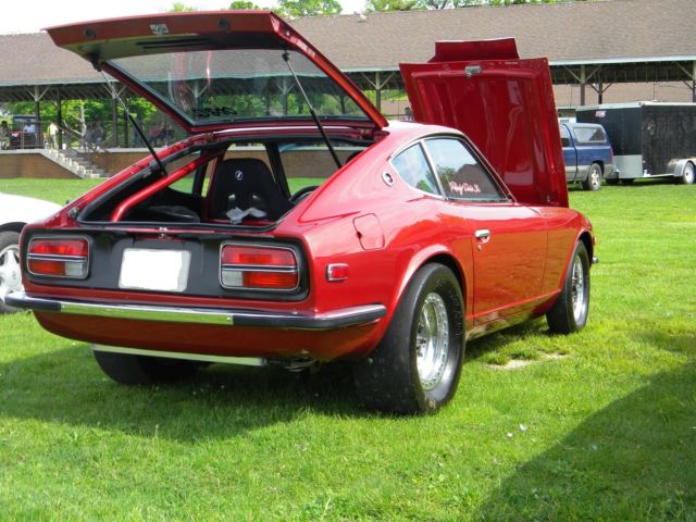 1972 Datsun 240z drag/street legal car, only one in the world and real head turn Thecar is currently licensed & insured in the state of California and driven to local shows on the weekends, the body is all steel except for the fiberglass hood, all windows are factory glass with working crank door windows. This car was completely restored in 2011 and you can not find any used parts through entire car,not even a small nuts and bolts The engine was rebuilt July 2014 and the car needs nothing, always draws a crowd where ever its taken, it has very beautiful glossy paint but has a small imperfections behind gas tank as shown on the picture, other than that itstill boast it's glory. No rust issues and is one of the cleanest z's you will find anywhere, the car runs and drives excellent, the paint color is red fire which is a ford color on the 06 mustang GT. The car has 12.5 to 1 compression and runs on race fuel, I have two carburetor set ups for the car, the carb on it now is a new light weight gas 750 HP. I also have a methanol carburetor that goes with the car, on methanol the car runs mid 9's and on race fuel it will run high 9's. Here is list of the parts installed and works done. -Engine 1.388cid Small Block Chevrolet 4 bolt billet splayed main caps 2. All ARP fasteners 3. 7qt pan 4. Dart 215 aluminum heads, roller cam setup 5. Ceramic coated Super Victor Manifold intake 6. Fluidyne balancer 7. Roller rockers & stud girdle 8. Moroso Vacuum Pump 9. Power Master Alternator 10. MSD 7al-3 ignition, MSD billet distributer, MSD pro power coil with MSD stree fire spark plug wires with stainless wire seperators 11. Triple chromed brackets and fabricated chrome valve covers 12. 4 core aluminum radiator & electric fans ARC flat touch switch panel 13.Weather pack connections used where applicable. Entire car has been wired very meticulously throughout and all lights, blinkers, reverse lights etc. works. -Transmission 14. Power-glide transmission with aftermarket SFI bell housing & aluminum deep trans pan, trans-brake 15. Electric shift valve-body 16. Little wizard delay box 17. Braided cooling lines ran in the frame rails exiting in front radiator support into cooler. Very clean installation. 18.Billet oil & transmission dip stick 19.Dana 44 Rear-end with mini spool/ 373 gears 20. Aluminum rear end cover 21. Ladder bar setup 22. 31 splined Moser axles -Brakes, suspensionsand and etc. 23. Wilwood brakes 24. $3500 spent on converting front of car to 5 lugs and larger disc brakes 25. One off Stock location Koni drag struts 26. Weld alumastar 2.0 fronts & bogart beadlocks on the rear 27. Custom billet aluminum battery hold down with Z insignia 28. Ceramic coated hooker super comp headers 29. Single chamber flow master mufflers ran to the rear end 30. Hurst quarter stick shifter 31. All silver face auto-meter gauges with speedo & fuel gauge 32. Throttle stop controller TSC-2 33.Corbeau seats with simpson harness 34. Interior is very close to perfect 35. Sound deadener through out on the floor & fully carpeted with head liner 36. Paint is flawless and straight color matched roll cage 37. Custom aluminum fuel tank and fuel neck in stock locations 38. All stainless steel braided fuel lines, radiator hoses are top quality braided hose, stainless & braided brake lines 39. All stainless steel fasteners under hood, very detailed -Every piece of the interior was purchased new or reworked at the upholstery shop -Factory dash recovered and recreated with Auto-meter gauges in factory location -Several very rare items for Z cars reworked with no expense spared -The car is super clean -Great car for the right person(like Mr. Donald Trump lol) -You'll be hard pressed to find another one like it anywhere -Pictures do not do it justice Happy bidding |
