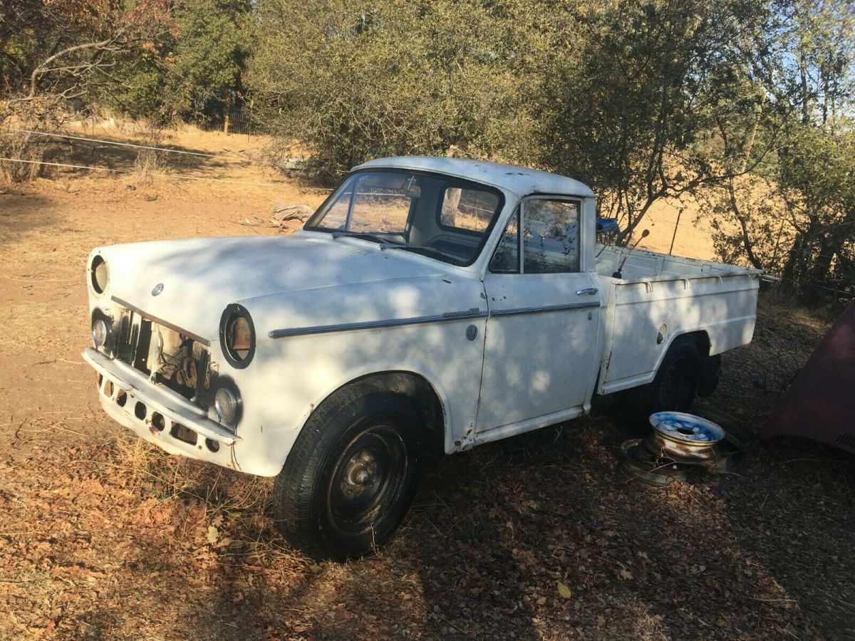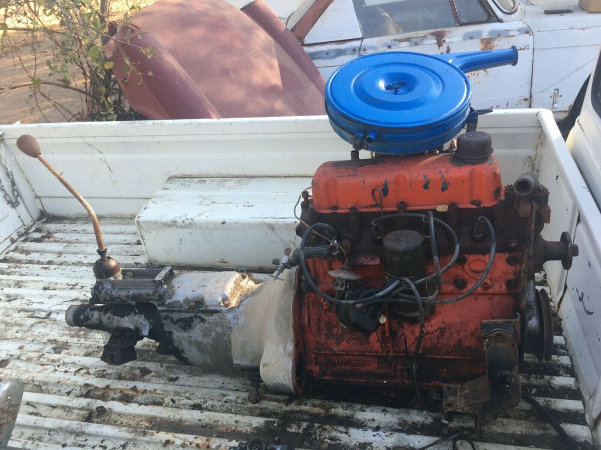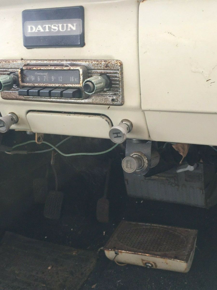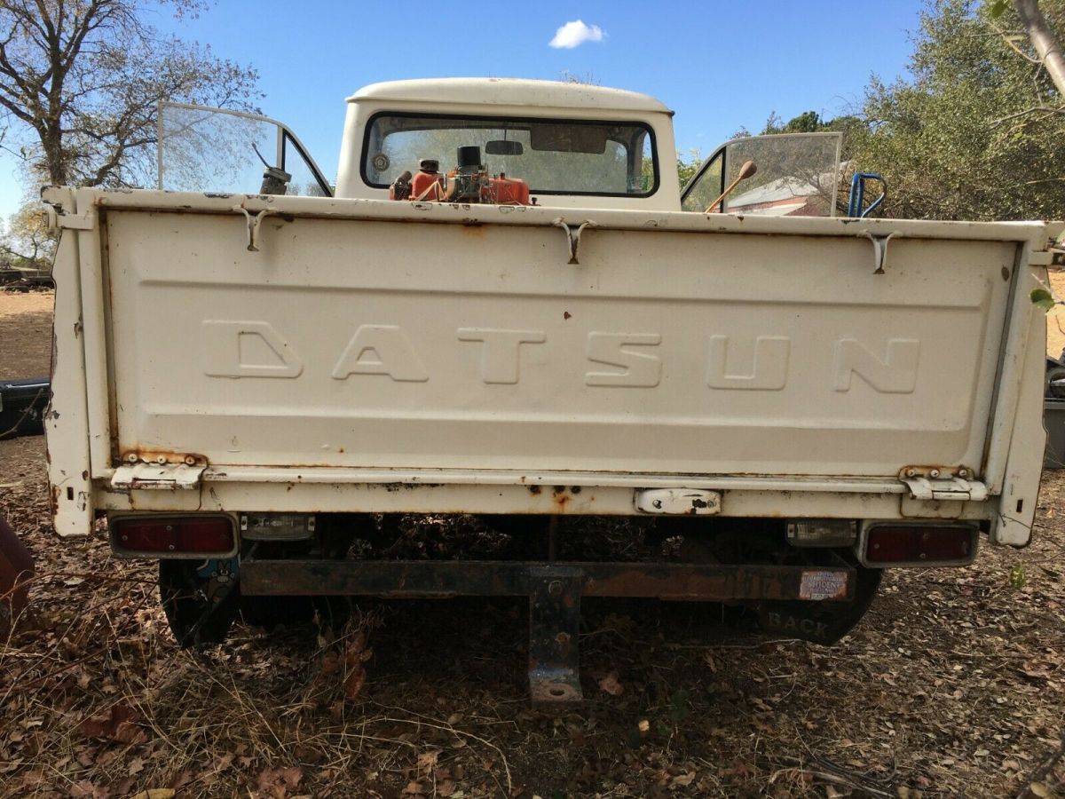 1963 rare floor shift four speed transmission model.Very straight and rust free example of a classic Datsun pick up truck. California car from Central Valley, stored in a dairy barn for 20 years. Bed and tailgate are in excellent condition. Includes front and rear bumpers, all lamps and lenses. Optioned out for a '63: Wide stainless trim, door locks on both doors, factory radio, factory parcel shelf, factory optional console speaker, floor shift (not on the column) trans cover, making this much more friendly to drive. E-1 engine and four speed transmission are in need of rebuild, not sure if the engine is original to truck. Includes: distributor, carb, starter, air cleaner, generator, flywheel, clutch, slave cylinder, ect. Ask for more pictures, I can send. Steering column is out of the truck, there are two columns and steering box included as well as a driveshaft. There is a small dent above the driver's side door on the roof. Some rust on the driver's side front cab/frame mount. Many extras included. Grill and headlamp surrounds, steering wheel and horn cap, turn signal indicator and cover. Factory 14" wheels and 3 hubcaps. This truck is an excellent candidate for restoration. Minimal body work. Paypal deposit of $500 due one day from end of auction. Balance due within 3 days. Truck is stored east of Roseville, CA. Must be removed from storage by December 18th. As pictured, as described. No refunds. Ask for more pictures, Ebay limits me to 12 images.