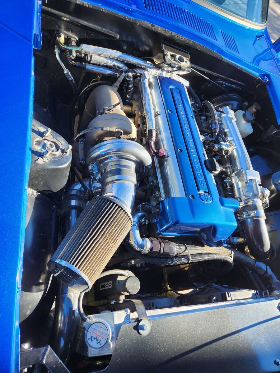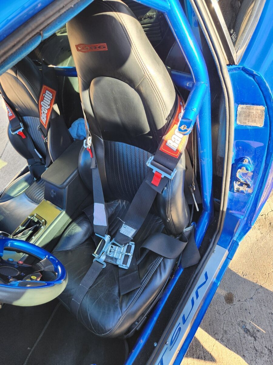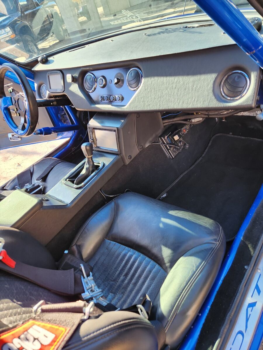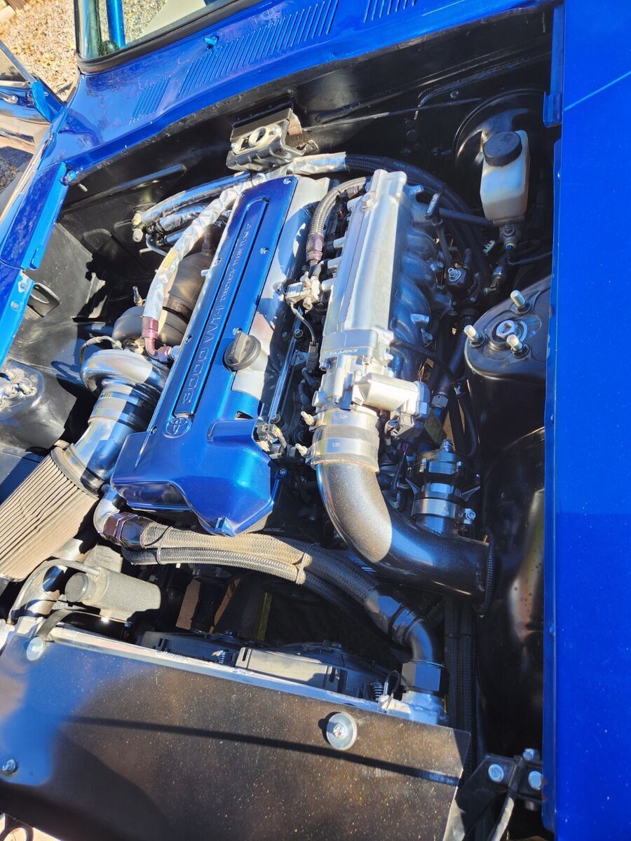 1973 Datsun 240z Clean Title 900 Crank HP (760whp) Adjustable via dash switch 8.50 NHRA Certified Chassis in 2024 Motor: 2JZGTE VVTI 1k miles on motor after refresh with new bearings and rings, BC 276 cams with BC valve springs with rebuilt head, Big single turbo kit with BorgWarner s369 turbo, Precision Wastegate (10psi) 3port boost solenoid (see Tech below). Lots of powder coated parts – Valve covers, Intake manifold, intercooler piping, Compressor Housing. The turbine and downpipe are Cerakoted. 4 inch down pipe leads to 3inch exhaust to Magnaflow Muffler. 4 Inch intercooler with very large radiator. Cooling is great on this car. Fuel system: 2150cc injectors, flex fuel kit, Magnafuel 750 pump, twin large serviceable filters, Fuel lab regulator, 10 gallon fuel cell under rear trunk floor. Transmission: 6spd manual transmission 07/08 350z new from Nissan (cd00A/9) colins adapters 2jztocd009 with stg5 Collins clutch and Collins short shifter kit. Wheels: BBS style 18X8.5 inch wheels front with Toyo Proxes 235/40R18 with 20x10 inch rims in rear on Toyo 888r 285/35R20 (street) and rear Weld Draglite 15x10 on Mickey Thompson 325/50R/15 ET Street R tires Exterior: Car was painted in 2015 in C7 corvette color “Blue my mind. Msa type1 front lip, aluminum front splitter, Ztrix 3 piece rear spoiler, shaved side marker lights, front tow hook, custom air paneling to front radiator intercooler cores, led headlights with turn signals integrated, custom led fitted in rear tail lights in stock housing. Interior: Custom dash and center console are handmade and wrapped in leather (see photos), Skillard Datsun inner trunk lid beauty panel, Skillard Datsun door sill plates, C5 Z06 seats, Vintage Air Mini Gen2 A/c, paint matched steering wheel. Center of the dash is the mode switch so you can pick how wild you want your ride to be. Leather shift boot with genuine R34 GTR Shift nob. Suspension & brakes: The car is back halved with large tubs out back and new frame rails from the firewall back that are integrated into the roll cage. 4 link rear suspension with ford 8.8 solid rear with 33 spline moser axels, Spool with 3.73 gears. QA1 rear coil overs, Wilsons driveshaft. Techno Toy Tuning front coil overs. Silvermine motor 13inch big break kit 4 piston Wilwood calipers front, Ford Mustang rear disc brakes and calipers Technology: AEM Infinity engine management with oil pressure, lean, and over boost protection, Boost by (gear/ethanol/mode switch/traction). Aem CD5 dash to watch all the vitals. Wheel speed sensor front and drive shaft speed rear for traction control (also mapped of mode switch). Drive By wire with Tarkk adapter and Bosch Throttle body (torque mapped off mode switch). Cartek wireless steering wheel 8 button system which controls: headlights, turn signals, cd5 dash controls, line lock. Push start keyless entry system with 2 fobs but one physical key. Key is to trunk lid. Door locks are blanked out. Sound system: Kenwood double din touch screen head unit, Bluetooth, Android Auto compatible. Alpine speakers front and rear. Back up camera active with reverse lights. Usb 3.0 charger in center console. Safety equipment: 8.50 cage certified to 2026, window net, 5 point harnesses, parachute out back with release handle near rear view mirror, removeable swing out bars for easier accessibility, driveshaft loop, kill switch on back of car. battery mounted under right rear truck floor which is removable with dzus fasteners. Charge lugs in original gas door location. Awards: Elite Tuner Elite of Show 2023, Disclaimer: This car has run 9.48 at 151 back when it had a powerglide automatic transmission and similar power. It is a lot more fun and a drivers car now then dedicated race car. The intercooler piping was done when the car was on skinnies which are no longer available so the right turn radius is half of the full left turn radius. Paint is 9 years old and It is mostly in good shape with a couple blemishes on the roof, hood and front right fender lip. Optionally available: Original 240z dash with dash cap. Loaded with Autometer Gauges. |