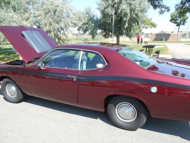 | this is not a fully restored car stripped to metal and repainted colorto matchoriginal paint but new style paint1978 360 block bored 40 stock style piston, odoo cam 1,000 to 5,500 .454/.475J type heads with harded seats, delbrock intake, ith 750 holley carb.duster stripes, ual snorkel hood scoop, ual exhaust, em tipsGreat street carGreat show carCar has lived all its life in the southwest (NM) so no rust |