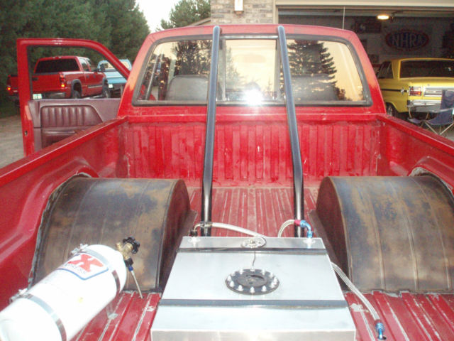 | This Dakota is ready for some street racing and the drag strip, t has a 408ci bbc e84 with a turbo 400 4500 freek show converter and trans brake. squeezed between the 33x18.5 et street's is a fab 9 strange center 4.56 gears and 35 spline axles all hooked to a 4 link back half. custom 8 point cage.ALL the parts are brand name and brand new I have all the paper's with parts and the dyno sheet. |