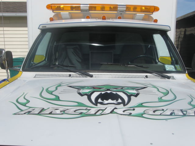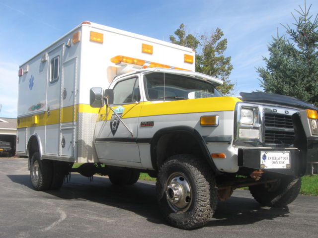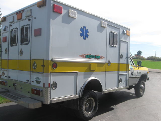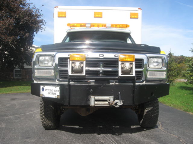 Here is a 1991 diesel w350 4x4 ambulance coach body, rom Virginia rust free. It has a clear New York title, ummins 5.9 intercooled diesel with an Automatic Transmission, s, b, c, ower locks,windows etc. Has a strong Warn Winch, n extra heavy duty frame, unicipality fire dept owned and serviced, ust had new severe duty Bendix brakes, ecent Good Year tires and spare, ual batterys and new front end parts complete with an alignment. This rig also has airlift bags, utomatic rear tire chains that are operated by two onboard compressors. It has a built in battery charger, nd block heater for long nights in the North Pole. All lights and sirens work and have origional red lenses included. Has a heavy duty heater and AC unit in coach. This truck has a lift kit installed, eeces hitch, till set up inside as an ambulance. It is a real show stopper, sed one season to pull a 24ft Articat trailer to shows, nd has a recent NY inspection. This truck can also be changed over to a flat bed, ow truck or pick up by just unbolting the ambulance body if you have multie uses for it. You will have a hard time finding another truck like this with under 62,000 orginal miles. This truck will be sold as is, or local pu and I will need a hundred dollars down payment to hold it for one week from date purchased, nd then I will only except a cash payment on the balance when you pick it up.