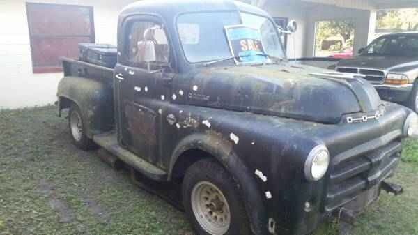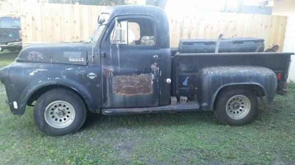 1953 Dodge Pickup. Truck is all original other than 12v upgrade that I can see. Motor and transmission are there. Original starter, ights on dash, orn, ipers work. No lights. Does not run or drive. Brakes need to be gone through. Flathead in line 6 rotated by hand 6 months ago however has sat with water, o unknown. I would plan on a complete tear down or swap running gear and make a rat rod. ALOT of possibilities with this truck. Tires are rollers only, eak down, ryrotted,etc. Bumpers and spare transmission included. Clear Fl title in hand. New battery last year. Tailgate is there, o wood in bed however metal slats are there for it. Drivers door has been creased in it doesn't latch shut and is bungied. Passenger door operates fine. Both windows roll up and down but are cracker, Windows open and close. If you would like specific pictures please ask before bidding. I am told this was an Air Force truck in its prior lif, ence the spotlight. NO RESERVE BID TO BUY! Shipping is buyers responsibility. CALL with any questions. 904 386 7883 Kyle