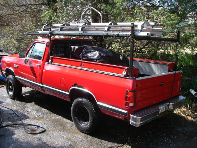 | I am selling my 1989 Dodge Ram. I bought this vehicle new in 1989. It is a standard cab and does not have enough room for the family. I also have too many toys. This truck has had Mobile one synthetic oil since breakin at 31,000. The engine is spotless inside. It has been a plow truck. All of the brake lines and pads were replaced last year it stops on a dime. The muffler and the tail pipe were replaced last year. The tires have great tread on them probably better than 50%. When i bought the truck i replaced the springs with a Rancho add a leaf kit to increase it to 3/4 ton. I also installed the borgenson adjustable steering shaft and adjustable pitman arm for the lift.I also had a custom ladder rack built for the truck. It will hold a ton easy with a removable back bar. Headache cage and shovel rack. The truck has an exhaust manifold that is leaking bad. The transfer case probably needs a new chain. When i drove it yesterday it sounded like one of the u joints is squeaking. Other than that this truck need to get driven. It has been sitting and that is when parts go bad. The plow rig in the picture does not go with the truck. The tool boxes and the break on the ladder rack are not included. |