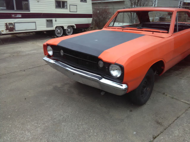 So this is a 68 dodge dart GT well its been modifyed ten ways from sunday . dodge dart . is and was a project been working on for a few years . Started as a 318 car been on a rotiseier taken to bare metal every where every bolt removed ec, then painted with por 15 epoxy paint 3 coats each inside and out .This is a California car no rust eve, was even under coated at one tim, thow i blew all that off was in poor condition after years .( stripped and por 15 ) . so has new rear end 355 limited sli, sure grip what ever you want to call it (have pictures) new spring, bushing, air shocks springs relocated in3/4 inc, lip of wheel well cut (room for bigger nicer whls) 5 on 4and 1/2 big bolt pattern . bad news is an 8 and 1/4 i never planned on abusing so didnt figure i need 8 3/4 maybe bad decissio, still brand news gear limmeted slip and all bearings. has frame connecters from crossmenber to torque boxes . transmission tunnel was cut and fabricated for the 4 speed auto followed directions and diagrams on Mo-parts tech page . new front suspension disc brakes off a 72 duster new tie rod, ball joint, torision bars,bushings,and steering box. Rebluit stock 2000 5.9 mag out of durango rt .nothing serious heads redon, ring, bearings oil pump (crank and clyinders still standar, crank was polished motor only had 60,000 miles on it . from durango i had wrecked . have all the fuel injection componets from 95 1/2 ton truck (2 sets) of every thing all wiring computor ect . And now divorse no where to finnish . it sucks WHATS LEFT need front windshiel, cant put inteior in will be ruined (have every thing in nice but not perfect conditio, can send pictures) need exhaust i wanted shorty headers $ has new motor mounts radiator suport this is there but bent then reinforced looks terible . need to finnish fabricatin trans mount pretty easy .couple simple welds i may do this still and The paint is cheap and ugly but needed something on it body is stait . have all the crome in near perfect condition . need to sell moving back to Cal also have 65 coronet convertable 5.9 ill sell in nice condition running Cal car also .have hundreads of pictures of dart threw stages and receipts . starting low bidding see what happens on interest