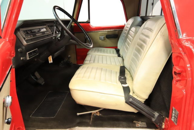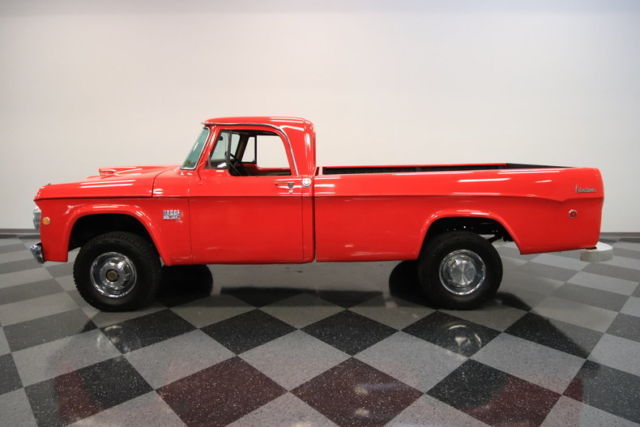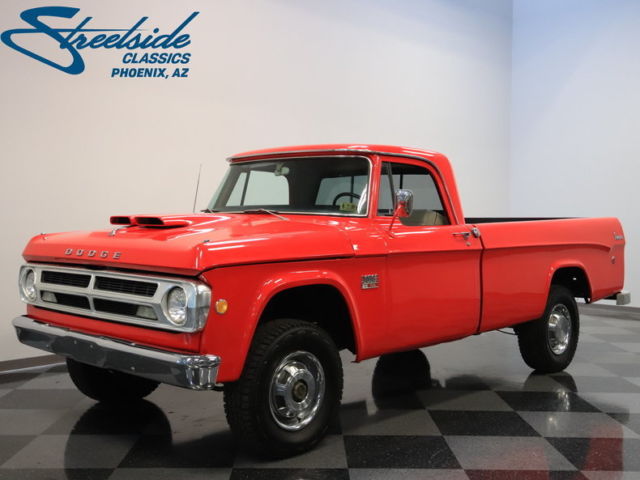 A vintage 4x4 pickup for an obtainable price is already enticing. But when you start to think how seldom you see a 1969 Dodge D100 Adventurer, especially with their original V8, and you realize that this complete and powerful pickup is a rare treat. You know this is the kind of truck that gets people talking. Dodge pickups had a style all their own. The face seems a bit beefier than the Fords or Chevys. But the sweeping line that starts at the headlights and runs the full profile is something you'd expect on a '60s sport coupe, not a workman's vehicle. So this is a handsome and rugged total package. That's why it looks so good with the professionally applied bold red. While this one has great original features like the bright chrome bumper and factory wheel covers, we think the added dual hood scoop gives this one some needed extra distinction. But as nice as this total presentation is for showing off, don't be afraid to use this 4x4 for true truck duty. After all, this has the added utility of the longer bed model, and it has been covered in liner paint to protect it from all your chores. Plus, you even have a ball hitch on the rear step bumper. Part of the premium Adventurer package means an upgrade interior. It starts with the split bench seat that offers space for three, but bucket-level individualized comfort for everyone. And since this pickup is believed to have averaged only around 1,500 miles annually, it's not hard to believe this can be original and still be so well presented. The thin three-spoke steering wheel has that perfect vintage truck feel, and it gives you a full view of the gauges. In true classic truck fashion, you're within easy reach of everything from the heat/defrost controls to the AM/FM/cassette stereo. When you take a look at the original 383 cubic-inch V8, we bet you wished you looked this good and correct after nearly a half-century on this earth. Of course, good maintenance always helps with this presentation. The blue block and valve covers join the large black air topper to remind you exactly what Mopar big block power looked like in 1969. And topped with a four-barrel carburetor, this one has plenty of power and adds plenty of bass for the stainless dual exhaust. Chrysler's stout A727 Torqueflite three-speed automatic transmission feeds the two-speed transfer case, so you can pull true 4x4 duty in this well-presented and rare Dodge. The sale comes complete with title documentation, so you can help trace the lineage of one of the most interesting vintage pickups around. It's impressive that this much distinction and utility is also so affordable. Don't miss out, call today!