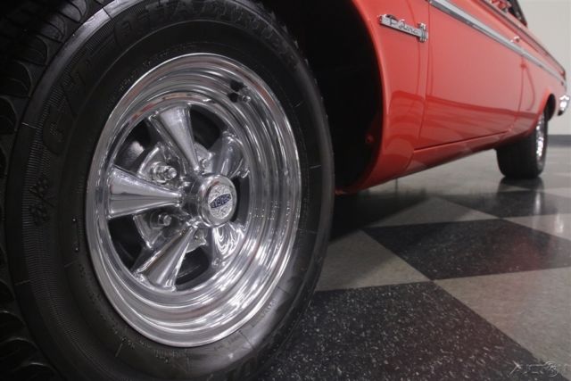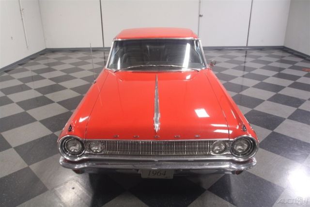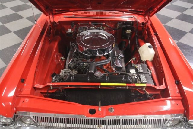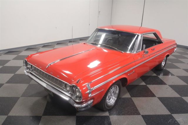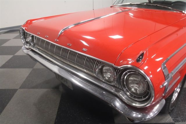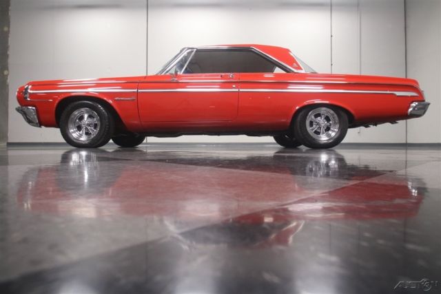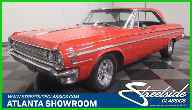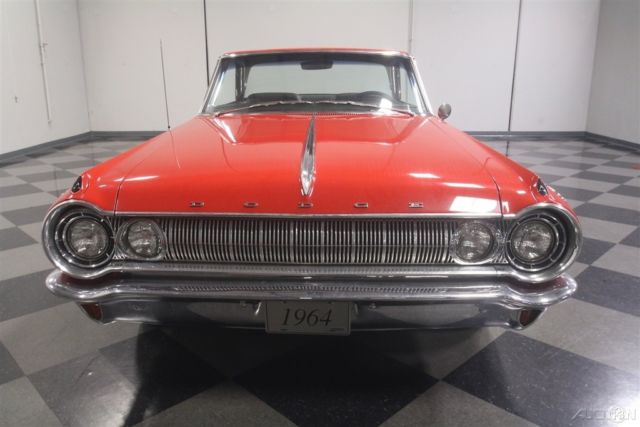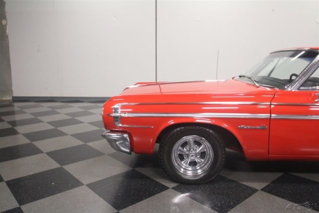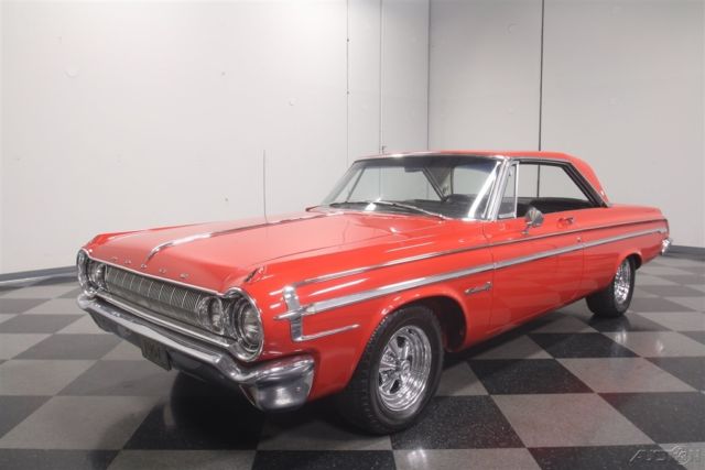 Back in the early '60s, you could buy a turn-key racecar from your local Dodge dealer, and it would look a lot like this 1964 Dodge Polara 500 hardtop. Of course, the full-race machines were incredibly rare, but the guys who knew their hardware also knew that when they saw a car that looked like this industrial-strength Mopar, they should probably steer well clear of it lest they get badly hurt. Make no mistake, this no-nonsense Polara carries what appears to be its original 426 "Street Wedge" engine, a more user-friendly version of the full-race piece. It also offers the same bare-knuckle street fighter look that screams high performance in a very low-key way. The bodywork is super straight, almost like it rolled out of the factory just a few years ago, and it shows off the work of guys who knew their stuff. They didn't have to work very hard since this was a clean, dry car with no major issues to handle. It has been refinished in its original code P Ruby Red, so maybe it's not designed to be subtle, but even in red, most guys won't know what's coming until it's too late. Chrysler's turbine look was in fashion in 1964, and they retained all the chrome and stainless trim on this one to enhance the sleeper look. To guys who know what they're looking at, this car is gorgeous. As for everyone else, well, don't say we didn't warn you. Just because it was built to pound the pavement doesn't mean it wasn't also comfortable and stylish inside. With big-car comfort and sporty twin buckets flanking a stock center console, it balances just the right amount of flash with no-nonsense attitude. The interior is in excellent condition, with nice seat covers, plush carpets, and a surprisingly well-preserved dash pad. The gauges are original and in good condition, and they're joined by a vintage tach on the steering column, supplanting the original one in the console, which sadly isn't working. Yes, that's a Hurst 4-speed in the center console, which really emphasizes the no-nonsense vibe of this Polara, and the wheel has a leather wrap to make it easy to grab. For effect, it retains the original AM radio (it doesn't work and you won't miss it), and there's even a full-sized spare in the well-detailed trunk to help with ballast. The engine is the car's original 426 cubic inch "Street Wedge" V8. Not related to the Hemi, it nevertheless was one of the most feared powerplants on the streets in the early days of the horsepower wars. It's largely stock save for an Edelbrock carburetor, and they obviously went out of their way to make it look as stock as possible. That means a stock air cleaner, stamped valve covers, Hemi Orange paint on the block, and those wild exhaust manifolds that just barely clear the shock towers. A 2.5-inch exhaust system is equipped with aggressive mufflers, and you'd better believe this sucker sounds nasty. The aforementioned 4-speed manual gearbox feeds the stock rear end full of 3.91 gears on a Sure-Grip limited slip, so the sucker is seriously fast on the roll. Clean floors, recent shocks, and period Cragar mags with fat 245/60/15 Dunlop radials round out the package. They say that beauty is in the eyes of the beholder, but this one is beautiful to the guy holding the time slips. A great cruiser that still has the moves. Call today!