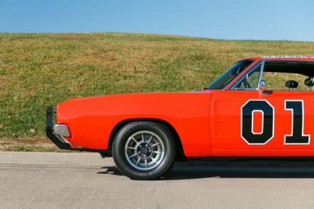 This Charger General Lee for sale has a 440 C.I. V8 w/ 6 Pack, A727 Torqueflite Transmission, 8 3/4 Rear End w/ 3.23:1 Suregrip, General Lee Paint Scheme, True 440 R/T Car From Factory, Factory Air Conditioning Car w/ Updated Compressor, Power Steering, Power 4 Wheel Disc Brakes, Pistol Grip Shifter w/ Center Console, Dual Mirrors, Day/Night Rear View Mirror, Front & Rear Seatbelts, Push Bar, Original AM Solid State Radio, Aluminum Radiator, Cross Drilled & Slotted Rotors, 15” American Racing Wheels, Iconic “Dixie” Horn
