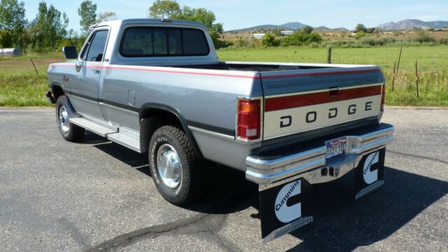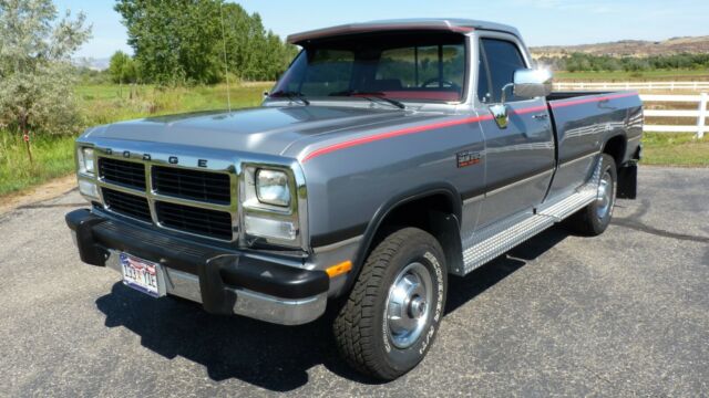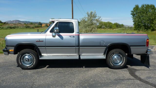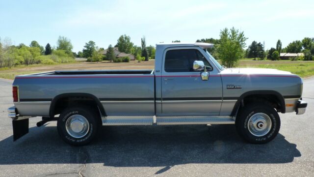 I'm listing this truck for my father. It is an all original BONE STOCK 1991.5 Dodge Ram W250 with the intercooled 5.9 Cummins and a Getrag 5-speed with 74944 miles. He originally purchased it new from Greeley Dodge in Greeley Colorado in 1991. He primarily used it to tow cars and vintage tractor to shows. This truck is a true survivor and is in excellent condition with new interior and paint. He even went to the trouble of purchasing new RAM 250 emblems, door seal plates, front marker lamps and the original stripe kit from Dodge dealers across the nation so it would be correct. We also recently installed new ACC carpet, new exterior mirrors, new window tint, new side window and door seals, new windshield, new KYB shocks, new DeeZee side steps that we had in storage since 1991 and new LT265/75R16 Cooper Discoverer A/T3 tires. Engine oil has been changed every 3K and all other fluids were changed out 6K ago. There are no leaks other than the rear transfer case seal is starting to show signs of a little weepage. Pretty sure I'm forgetting some of the new parts that were installed. Dad has opted for a later model Ram diesel with an automatic transmission and hates to see his '91 sitting there and not being driven and enjoyed for what it is