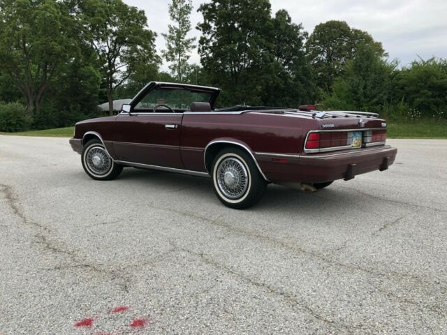 Up for sale is my exquisite 1986 Dodge 600. This is the cleanest K-car you will find in the midwest. It has been garaged it's whole life and has only 47000 actual miles. There isn't a speck of rust anywhere on the entire car and everything works exactly as it should. It has beautiful leather seats with power locks, power windows, tilt wheel, cruise control, power top, A/C, AM/FM radio with cassette, and an automatic transmission. The top is in great shape and this year it had a brand new A/C compressor, as well as all new brakes and brake lines. If you request more pictures, you will be able to see the complete lack of rust on the entire car, even underneath. I can also detail the front and rear bumper's paint has faded. The bumpers themselves are in great shape. They are made from a different material and I assume they simply faded with time. Dodge 600's are incredibly hard to find, let alone in this condition. I highly recommend you come check this car out. You can own a piece of Chrysler history yourself and be the envy of everyone at car shows. Please contact with any questions.
