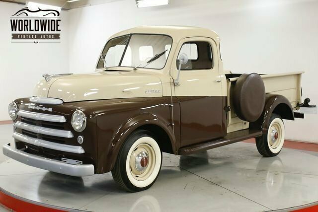| Interior Reupholstered bench seat Reupholstered door panels Reupholstered headliner Carpeting Restored dash Original gauges Original steering wheel Exterior Rare 1948 Dodge Brothers B1C 5 window truck Thousands invested in the restoration per previous owner Professional bare metal repaint. Root Beer Brown and Olive Powder-coated factory steel wheels Dodge hubcaps Dual Spare tires with tire covers |