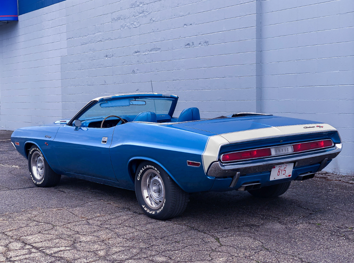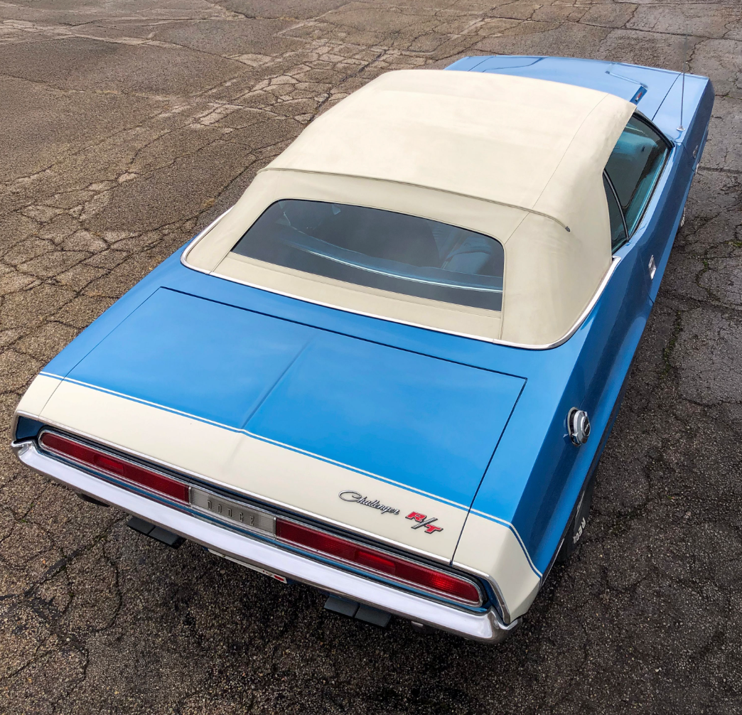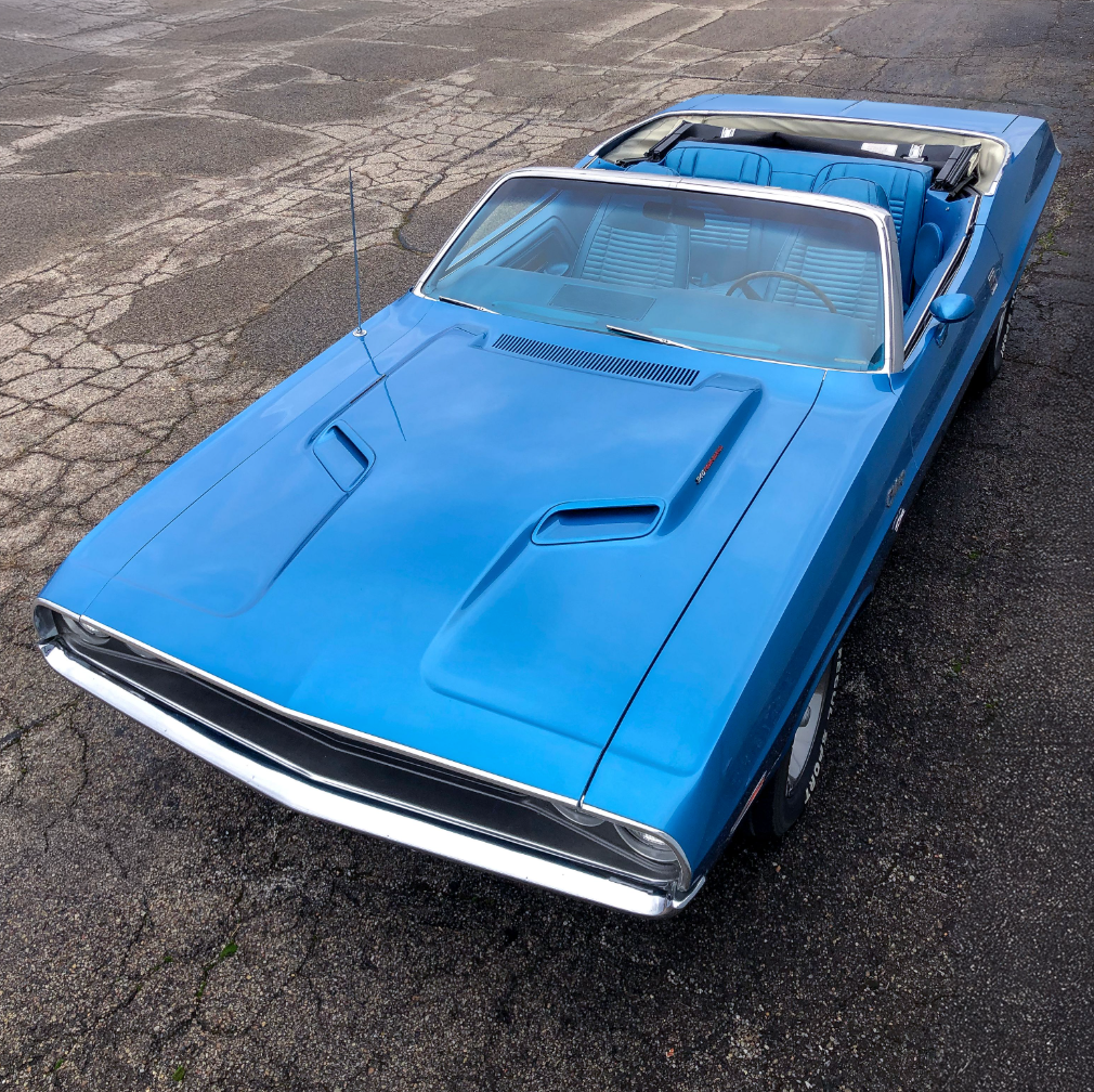 1970 Dodge Challenger Convertible – StunningEB5Blue Fire Metallic with 340ci 4-bblPower If you didn’t find what you were looking for at Mecum last month, here is a chance to acquire a classic Mopar convertible in one of the most popular color combinatins. Aniconic American muscle car that combines power, style, and rarity, this1970 Dodge Challenger Convertibleis the perfect addition to your collection. Finished inBright Blue Metallic (EB5)with awhite convertible top andwhiteBumble Beetailstripe(V3W, V9W), this classic Challenger turns heads wherever it goes. Powerful 340 V8 Engine & Performance Package Under the hood, this Challenger is equipped with the legendary340 cubic inch V8 (E55), producing275 horsepowerthrough aHeavy Duty Automatic Transmission (D32). This car also includes the factoryA66 Challenger 340 Performance Package.The 1970 Dodge Challenger A66 package wasa performance upgrade that included the 340 cubic inch V8 engine, heavy-duty suspension and brakes, and a R/T-style hood.It was similar to the R/T model, but without the R/T badging.Note that I added the R/T badging after the recent touch-up repaint. The A66 packageadded extra performance features like the dual-scoop performance hood from the R/T model, improved suspension and handling, and a 26-inch radiator. Thedual exhaust (N41) with chrome tips (N42)that were part of the A66 package delivers the unmistakable muscle car sound that enthusiasts crave. Headers were added by the previous owner to bump up the horsepower even more.The A66 package was first offered in late September 1969and it was not highly advertised, so very few examples were sold, making the A66 package an uncommon choice, adding to the desirability of this Challenger. Classic Muscle Car Styling & Interior Features Step inside, and you'll find a well-preserved interior featuringblue high-trim vinyl bucket seats (H6B6), acenter console with a woodgrain panel (C16), and full door panels (000) that enhance the car’s vintage appeal.The interior has been restored with a new dash pad, new seat covers and new carpet.The driver gets the convenience of aleft-hand remote racing mirror (G33), and the car is equipped withthe rarefactory air conditioning (H51)in a convertible. Convertible Enjoyment with Power Top Nothing beats cruising in a classic muscle car with the top down, and this Challenger makes it easy with apower-operated convertible top (P37). The white top beautifully contrasts with the blue body, giving it an unmistakable look that stands out from the crowd. Additional Features & Factory Equipment