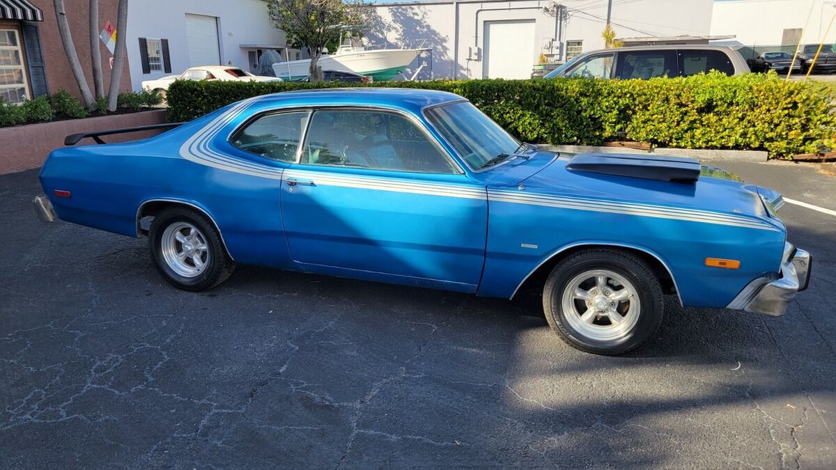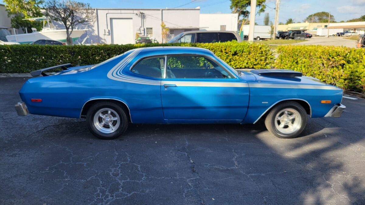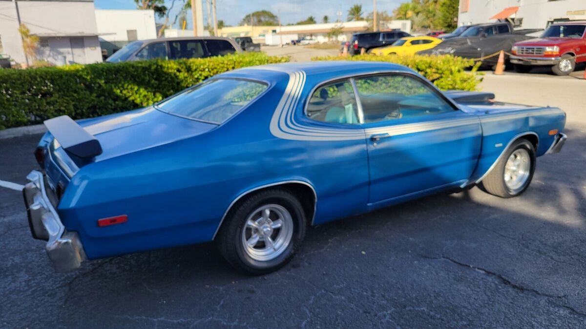 PAINT BLUE INTERIOR OEM BENCH SEATS, OEM WHEEL STOCK 318 V-8 ENGINE DUAL EXHAUST AUTO TRANS POWER STEERING POWER BRAKES, GOOD BUMPERS AND SOLID TRUNK FLOOR AND UNDER CARRIAGE, CUSTOM WHEELS 15" RUNS AND DRIVES INTERIOR GOOD, NW AM RADIO DETAILED E AUTO TRANS, AIR CONDITIONING CAR COMPLETE NEEDS TO BE UPDATED, POWER STEERING FRONT POWER DISC BRAKES MANUAL WINDOWS AND LOCKS RALLY WHEELS SOLID TRUNK FLOOR AND UNDER CARRIAGE, CLEAN/FAIR UNDER CARRIAGE, FREE SHIPPING ONLY WITH BUY IT NOW OPTION AND WITHIN THE CONTINENTAL USA ONLY FOR FULL PRICE NO BEST OFFER, THIS CAR HAS BEEN UNMOLESTED AND PRESERVED MOSTLY ORIGINAL OVER THE YEARS, WORKS WIPER FLUSH. SOLID TRUNK FLOOR AND UNDER CARRIAGE WE OFFER COLLECTOR AUTO LOANS AND WORLD WIDE TRANSPORTFREE SHIPPING ONLY WITH BUY IT NOW OPTION AND WITHIN THE CONTINENTAL USA ONLY FOR FULL PRICE NO BEST OFFER.Matching numbers 318 CI V-8 engine OEM BILL SHEET ATTACHED TO PICSHydramatic transmissionPower steeringFront disc brakesSoft Ray tinted windshieldAMERICAN RACING Rally wheelsDual Flow-master exhaustSPECIFICATIONSENGINEV-8TRANSMISSION:Automatic EXTERIOR COLOR BLUE INTERIOR COLOR BLUE 2 TONE MAKE DODGE MODEL DARS SPORT BODY STYLE SPORT COUPE HIGHLIGHTS DRIVER QUALLITY Matching numbers 318 CI V-8 engine 5.2L Hydramatic transmission Power steering Front disc brakes Soft Ray windshield Rally wheels Dual Flowmaster exhaust PHOTOSADDITIONAL VEHICLE DETAILSFamily OwnedGOOD engine and transmission*Automatic*Power Steering *Power Brakes DISCLOSURE*Cosmetic: paint driver's quality with flaws, dents, bondo (See detailed pictures).*Mechanical: Sound.*This vehicle is being sold mileage exempt due to age. Mileage advertised reflects current odometer reading. Video link:https://www.youtube.com/watch?v=CQXPSKuucsAAttachments areaPreview YouTube video 1975 Dodge Dart Sport 318NOTE: Sold as seen in pictures. Customers please note every computer shows colors differently. All measurements are approximate. Hardware and instruction/ installation manual not included. Product have some stains, dents, scratches and/or scuffs from use and handling.TERMS /CONDITIONS: These Goods are offered subject to prior sale, withdrawal, without notice. Buyer has right to inspect said Goods prior to final bid. Acceptance of bid shall constitute a binding contract. This sale is "as is, where is," in Ft. Lauderdale, Florida USA, with no warranties express or implied as to condition, quality, or fitness for a particular purpose. Seller shall not be liable under any circumstances for any defects patent, latent, or otherwise. The Buyer acknowledges that no guarantees or warranties were expressed or implied by the Seller or his agent regarding the condition, quality or fitness for any purpose of the Goods.DISCLAIMER: Descriptions of these Goods are offered in good faith but Seller cannot guarantee or warrant the accuracy of this information nor warrant the condition of the Goods. The buyer acknowledges their responsibility to conduct such inspections and inquiries as they deem appropriate Following all the guidance and terms upon the company policy.JURISDICTION/VENUE: By placing your bid on this auction for these Goods you agree and accept that the rights and obligations of the parties hereunder shall be determined, in accordance with Florida law without regard to choice of law doctrines. The parties agree to submit to personal jurisdiction of Florida courts for any action relating to or arising under the terms, conditions, disclaimer as set forth above. Venue for any action arising under or relating to this transaction shall be in the court of appropriate jurisdiction for Broward County, Florida. If any proceeding is brought to enforce a parties right under this agreement, the losing party shall pay all costs and attorneys' fees of the prevailing party.these terms are not negotiable.A $200.00 non-refundable deposit is due within the end of the auction close to cover publication and advertisement fee, and the remainder is due within 5 days AFTER THE END OF THE AUCTION, WE ACCEPT money order, cashier’s check, cash, or bank transfer are acceptable forms of payment. The buyer is responsible for the pick up/shipment of this vehicle, after has been fully paid.WE CAN HELP YOU SHIPPING IT ANYWHERE AT YOUR OWN COST. The car need to be picked up within 10 days after the auction ends, unless and extension has been requested previously and has been granted/agreed and approved by the seller or Storage fees charges will be accumulated thereafter. Please ask questions before biding, and bid to buy, not to come and see if you want the car. AS IS - NO Warranty As-Is No Warranty This vehicle is being sold as is, where is with no warranty, expressed written or implied. The seller shall not be responsible for the correct description, authenticity, genuineness, or defects herein, and makes no warranty in connection therewith. No allowance or set aside will be made on account of any incorrectness, imperfection, defect or damage. Any descriptions or representations are for identification purposes only and are not to be construed as a warranty of any type. It is the responsibility of the buyer to have thoroughly inspected the vehicle, and to have satisfied himself or herself as to the condition and value and to bid based upon that judgment solely. The seller will make every reasonable effort to disclose any known defects associated with this vehicle at the buyer's request prior to the close of sale. Seller assumes no responsibility for any repairs regardless of any oral statements about the vehicle.ALL THE NECESSARY PAPERWORK MUST BE DONE BY THE BUYER THAT WILL GET THE CLEAN TITLE AND IS HIS ONE AND ONLY RESPONSIBILITY TO PAY ANY IN/OUT STATE TAXES AND REGISTRATION.INSPECTIONS ARE OPEN M-F FROM 1PM-4PM EST ONLY TO AUCTION WINNERS BY APPOINTMENT (AFTER THE $200 DEPOSIT HAS BEEN COMPLETED), NO TEST DRIVES ONLY SURVEYS AND INSPECTIONS, ENGINE TEST RUN AND MISC HAS BEEN POSTED IN THE YOUTUBE VIDEOS AND WE CAN DO ONSITE TE