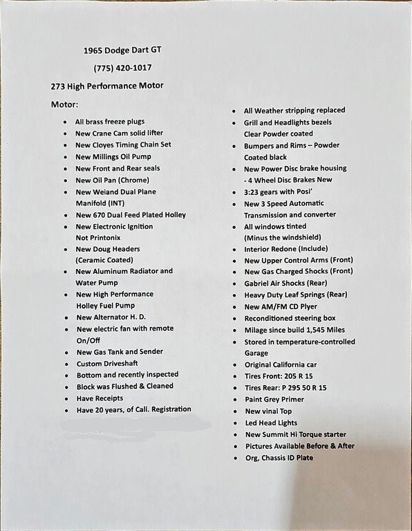 1965 Dodge Dart GT For Sale in Reno, NV 89511 This Dart is powered by a 273 V8 engine paired with a 3-speed automatic transmission. It shown with a gray exterior and a black interior. Features Chrome Accents Vinyl Interior AM/FM Audio System Interior Weather Stripping Owner’s Description “This rare 1965 Dodge Dart GT is a classic that's been tastefully upgraded and well cared for. a 273 cubic inch V8 with only 1,560 miles, it features a new cam and lifters, a Cloyes timing set, and a milled oil pump for improved performance and reliability. Th 1965 Dodge Dart GT For Sale in Reno, NV 89511 This Dart is powered by a 273 V8 engine paired with a 3-speed automatic transmission. It shown with a gray exterior and a black interior. Features Chrome Accents Vinyl Interior AM/FM Audio System Interior Weather Stripping Owner’s Description “This rare 1965 Dodge Dart GT is a classic that's been tastefully upgraded and well cared for. a 273 cubic inch V8 with only 1,560 miles, it features a new cam and lifters, a Cloyes timing set, and a milled oil pump for improved performance and reliability. The fuel system has been refreshed with a new tank and sender, and stopping power is upgraded with 4-wheel disc brakes. It’s equipped with a 3-speed automatic transmission and updated interior weather stripping for added comfort. A solid, vintage ride with great mechanical updates—perfect for cruising or collecting.” For Assistance with Financing, Transportation, Or Inspections Call or Email Customer Support 402-502-8385 *Caveat Emptor* Please Remember to Inspect Vehicle Prior To Purchase! |