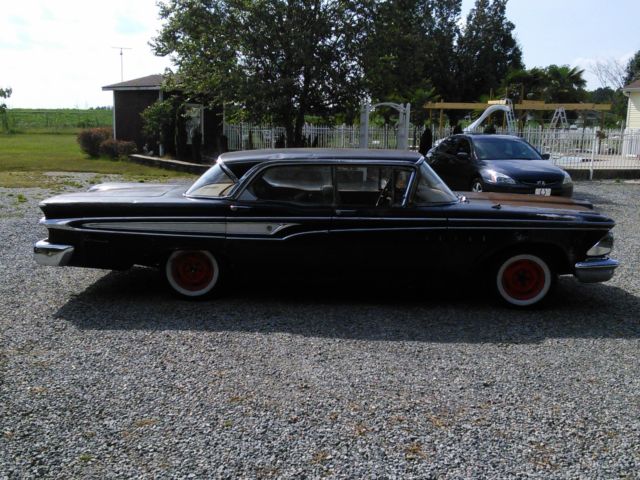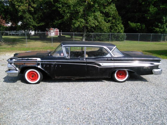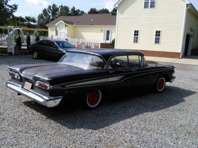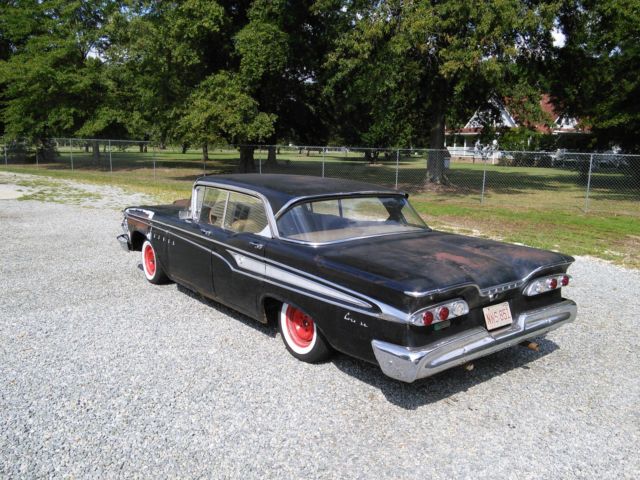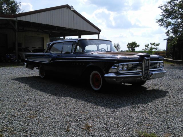 ***This is a relist. Original winner never paid*** Purchased the car to make a family cruiser or rat rod out of. However, nce I started researching the numbers I found that it is all original and appears to have some great options. This Edsel was last registered in 1980 but that title was signed over and now has a current title. The owner passed away and the widow had the car in storage ever since. The car ran and drove until parked. Over the passed 30 years or so the brakes and engine have become stuck. The engine is a 361 Super Express V8 (which is the highhorsepoweroption for the Edsels)--303HP and 390 torque. The transmission was also upgraded to the 3 speed dual power automatic from the factory. Car is equipped with power steering, ower brakes, nd power front seat. Interior is all original to include seat coverings, arpet, eadliner, nd door panels. The front seat has a rip down the seam. The headliner is in fantastic shape. All glass is in great shape. The car still maintains the original patina which was Jet Black paint and was a single color which was rare for these cars. The brakes will need to be replaced due to the time they sat seized up (to include drums). The power brake booster will need to be rebuilt due to debris in the reservoir and overall dried out seals. The driver's rocker panel will need replaced and the passenger front fender has some rot near the hood. The keys have been lost somewhere along the way but with a battery hooked up all the lights work and the horn and power seat work. The original spare tire (as best I can tell) is still with the car also.All four wheels are plain steel 14" rims and appear to be matching. All four tires are in close to new condition (80-90% tread maybe). The fronts match (185). The rear are bigger but are slightly mismatched (195/205). All have atlas white wall inserts. I like the set and will happily keep at time of sale and knock $150 off the price and will put four wheels and tires back on the car that can be used for rolling around the driveway. Thewiper motor, sh tray, nd air cleaner are the only hard parts missing. Everything else is intact. The chrome overall is in good condition--the bumpers are in very good condition. This listing will run until the auction ends without exception. There is no reserve and we are just looking to find this car a good home rather than turn it into something else. Pick up or shipment is up to the buyer's discretion but I will help any way possible--to include getting the car to a bigger city..