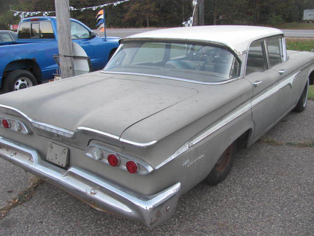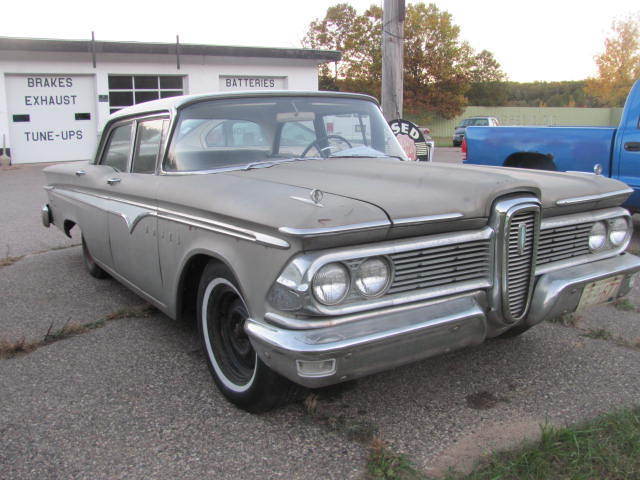 1959 Edsel Ranger 4dr sedan, cyl, speed manual, ar was sold new at Medford Motors Wi Ford Dealer, hen traded back in in 1974, ar was parked in a shed ever since and started periodically. Car has had body repairs done to it prior to 1974 in the trunk pan and rear quarters and rockers, nderside is rust scaled but not rotten, ar has a radio delete board and no other options, riginal grey color and black interior. Car has a had some new parts on it such as a fuel pump and ignition tune up. Car does not run unless you poor gas down the carburetor so obviously something else is wrong and it seems to be maybe the eccentric that runs the fuel pump arm. I did drive the car for a few miles and it shifted well and the clutch worked great, rakes were ok but pulled to one side so those will have to be gone through to make a daily driver out of it. All lights worked. Windshield is cracked. Car is complete, isconsin buyers are subject to tax and title fees as title is from a dealership. email with any questions