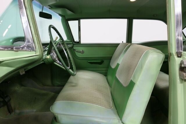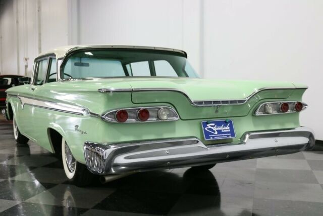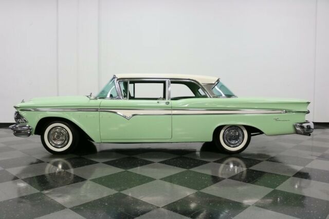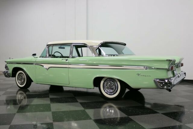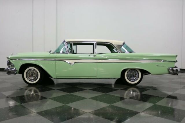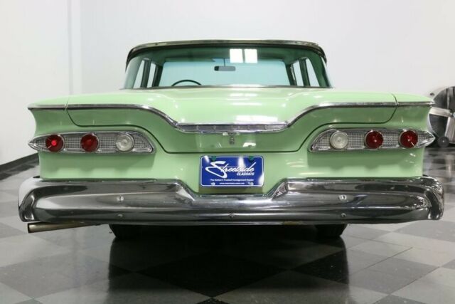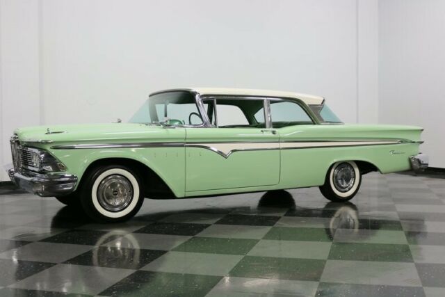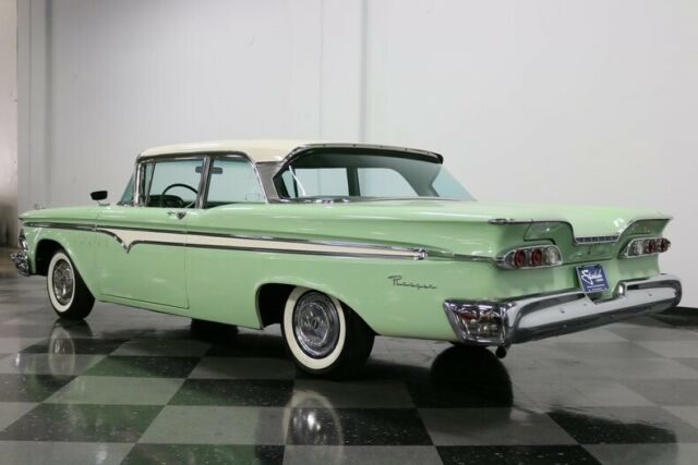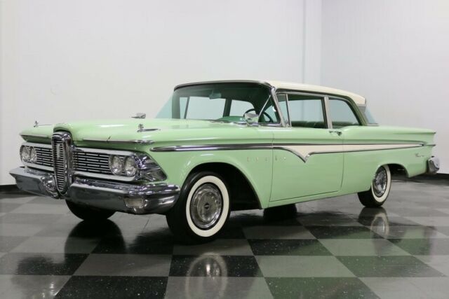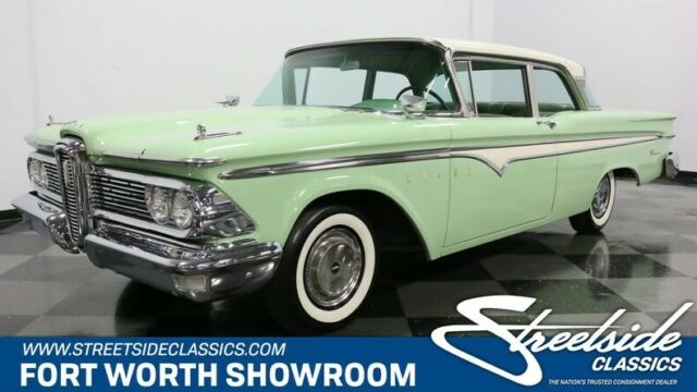 It was once referred to as The Car of the Future - a big burden for any car model to shoulder. The Edsel represents a very unique chapter in automotive history. Named after Henry Ford's son, the nameplate was one of the first to lean heavily on automotive research to shape a finished product. While overly lofty expectations and a bit of revisionist history might lead you to believe otherwise, the Edsel made a serious impact in its heyday -... its initial launch was the second biggest in history at the time and, as this 1959 Edsel Ranger illustrates, the work was quality both inside and out. You don't often see Edsels like this Ranger on the road, but when you do, their overall uniqueness will strike you right away. While they sit on a Ford chassis shared with a couple of other models, the split grille up front separating its four oblong headlights, as well as the distinctive hood bearing its prominent ornament, look nothing like those of any other model in the Ford stable. This '59 has had the unusual good fortune of having logged under 77,000 miles and it not only carries its original colors both inside and out, but still wears what is likely its original paint. Featuring a mist green foundation with white encircling the cabin and accenting the sides, it still presents pretty darned well. The overall exterior alignment on this classic is a testament to just how sturdy a product Edsel made - take a lap around and you'll notice that the lines are very solid, with tight even gaps surrounding the body panels, and no frame sagging to be found. The interior remains in its original configuration and, bearing in mind that this '59 has yet to venture into a restoration shop, is in impressively clean condition. The original components, including the carpet, seats, headliner and door panels, may show some evidence of use, but they've really come through the years in solid fashion. The bench seating - featuring vinyl covers with cloth accents - is still well-padded and comfortable and the windows on both sides roll up and down with no issues at all. The sizable factory steering wheel still sits on the column, and just beyond it the dash area is a definite high point. It's got a thoroughly futuristic design that must have really been quite a departure from the norm when this Edsel rolled out, with the speedometer presiding over a pair of oval shaped additional displays just below, chrome accents at its corners and a surprisingly fresh looking dash pad over the top. You're not likely to run out of luggage space here - the trunk borders on cavernous. This rarely seen classic is a strong driver. What's almost certainly the original 223 cubic inch inline 6 motor sits in a very nicely detailed compartment with its factory Holley carb sitting underneath a compact air cleaner painted to match the adjacent valve cover. Some time obviously went into getting this engine bay looking its best - the powerplant is surrounded by freshly painted inner fenders and fire wall and both the hoses and wiring look to have been recently replaced. Having benefitted from unusually light usage over the years, the 6 cylinder is in good form, starting up promptly and running solidly as it teams with a period correct "three on the tree" transmission. This very fashionable cruiser makes quite an impression as it passes by on its set of 14" stock wheels outfitted with Coker Classic whitewalls for just the right vintage look. This 1959 Edsel Ranger offers a chance to get behind a truly unique classic that's running strong and looking great. Call today!