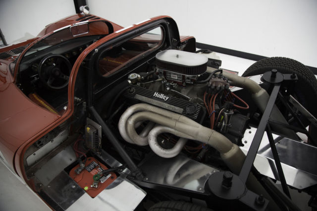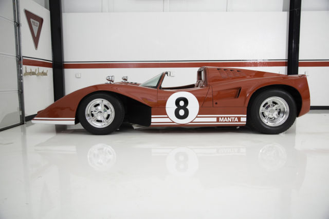 TheManta Miragewas an American mid-engined vehicle produced byManta Cars, owned and operated by American brothers Brad and Tim LoVette located inCosta Mesa, California* from 1974 to 1986. The Mirage, originally referred to as just the 'Manta', or the 'Manta Can-Am', was a light-weight road-legal racing car. The Mirage's steelspace framechassis was fitted with a high-output V8 engine and 4-speed transaxle. Most Mirages were equipped with 327cu. in. (5.4L) or 350cu. in. (5.7L)Chevrolet small block V8 engines, additionally several vehicles were fitted with 454cu. in. (7.4L) V8s sourced from Chevrolet as well as 460cu. in. (7.5L) V8 engines sourced from Ford. The original Mirage design mated the Chevy V8 to a Corvair transaxle via aKelmarkadapter and remote shifter. The bodywork was all hand-laid fiberglass, pre-colored in a range of gel-coat colors.Gull-wing doorswere fitted to a removable top section, while the doors flip forward for entry. With curb weights as light as 1,900lbs (680kg), the cars could be built by the factory or their owners to be extremely fast.