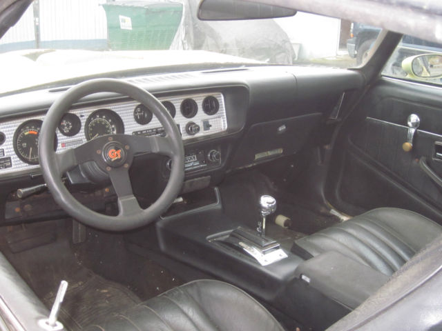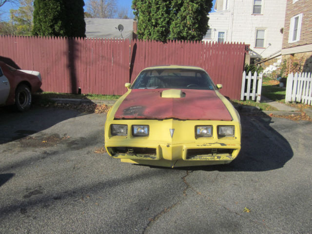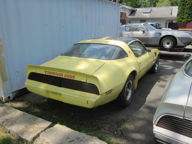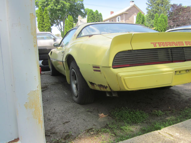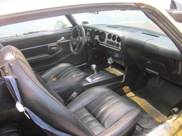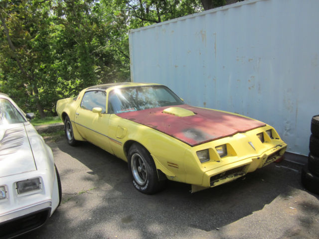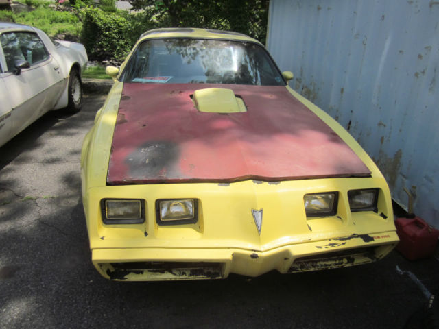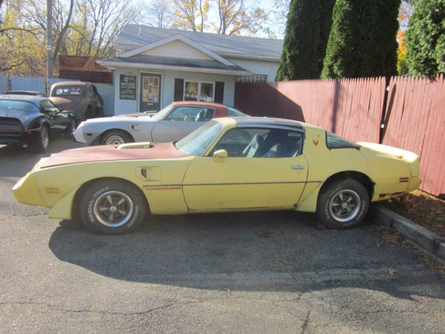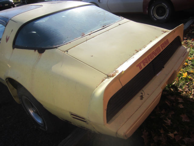 | 1979 Pontiac Firebird Trans Am 403/ auto (assumed # matching) T Tops A/C. Tilt. Cruise Control Yellow/ Black Dont want to part this out as it is very original. complete and much nicer starting point than most entry level T/A's I have seen. Perfect for LS swap or Pro Touring car. Great project to restore or build to personal taste. Car is more or less complete. Interior in good condition. Body is not bad but will need some minor patches on fenders / quarters as shown. Will need a new tail panel (avail new). Floors & frame rails look in good shape as shown. Rad support in good condition as with shaker assy. Doors. fenders and 1/4's are very savable. No need to replaced them. Engine is stuck from sitting. Car rolls Clean NJ tittle. Picture of T/A with 17" rims is NOT the car of topic but a representation of what it could look like once restored. |