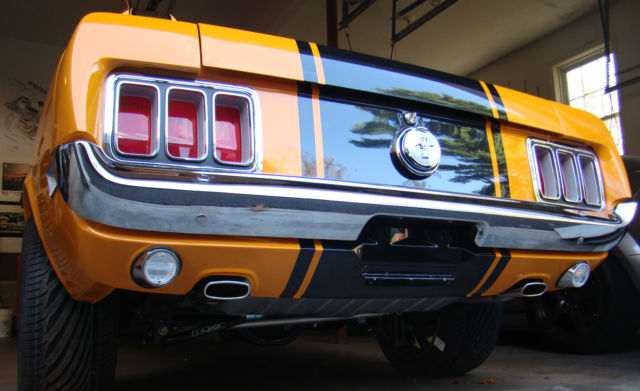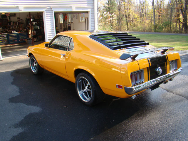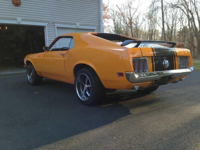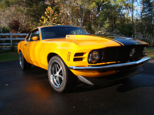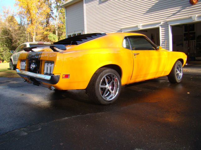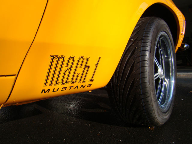 Wow! What a powerful piece of history!Clearing out my garage for a new toy. Up for bid is a 1970 Mustang Mach 1 Resto-mod. Over$70K invested plus time and sweat.EVERYTHING has been changed to new: - US Forged Cobra Wheels- Vredestien tires- Complete Maier racing suspension wi panhard bar- Sub-frame connectors- Pro rebuilt 351C dynamic dyno at 428hp / 429ft lbs: roller cam/rockers, tuds and guides; forged rods & pistons; new valves; new oil pump; straightend & polished Ford crank; bored and honed (0.030"); high-performance cam;VERY RARE weber induction set up with 48IDA downdraft, acuum balanced and all mechanical linkage wi pressure gage;- Currently has RUG-AV4 toploader wi/original Hurst T shifter; will consider swapping TKO 5-speed at reserve price- 9" Nodular differential with billet 3.89 gear set (Trac-lock - not spool); 32 spline axles- 4 wheel disc brakes- Complete interior restoration including new upholestry, eadliner, ll panels, ights, arbon finder inlays- Complete new wiring harness; Trunk mounted battery and solenoid to keep engine bay clean; Dakota digital analog look instruments and senders- MSD ignitionUSB/iPod compatible deck; 4 speaker system; remote antenna- Aluminum radiator and electric fan set- New gas tank, ines, ump & filters- LED lighting- Body completely refurbished. Flawless Harvest Yellow (school bus yellow) with Tuxedo Black SuperSnake stripes across a cowl induction hood (for the webers); All chrome lighting housings are new; all plastic is new; all stainless is refurbished and shines better than new; all seals new; new badges- New sport slats (back window) / spoiler front chin- Carbon fiber deck wing- Thiscar is not forthe feint of heart; history and racing enthusiasts will thoroughly enjoy this fine automobile.