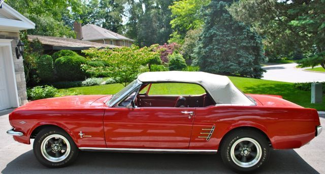 | Beautiful 1966 Convertible Mustang V-8 289. Red exterior, ed interior with white top. Owned this lovely model since 2008 and bought it from the original owner. Garaged all year long just outside of Chicago. We have re-done the entire brake system, pgraded the rims and tires. Added seat belts in the rear and a 6 CD changer to the stereo. |