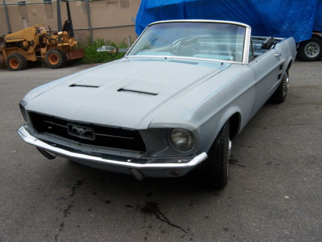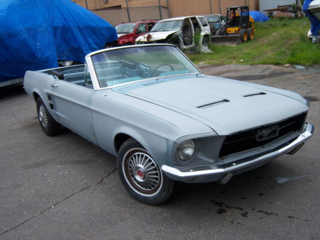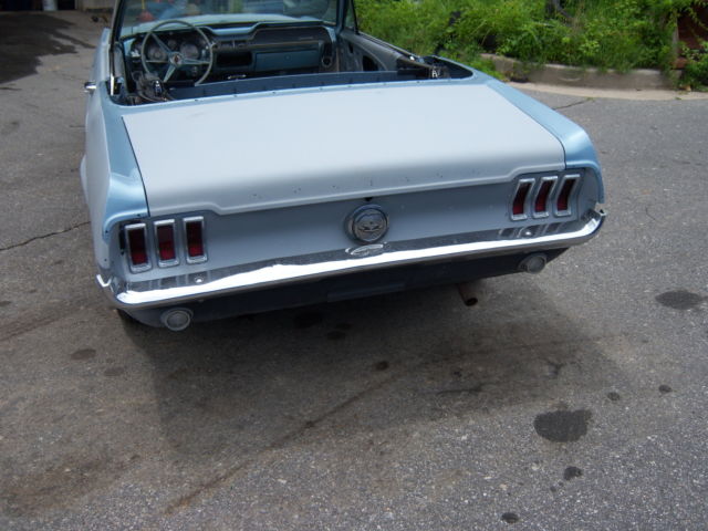 For yourconsideration this is a nice solid 1967 Mustang Convertible project . The car is an original V8 auto. trans. factory front Disc Brake Factory Air Condition car The body is very solid but it appears have been re-worked buy a prior owner the workmanship is professional looking and doors fenders, ockers, uarter panels etc are very solid with no sign of rust front floor pans were replaced at some poin, he frame and underside is very good . The seats have all been redone alone with the rear side panels with a new interior kit in theoriginaltwo tone blue, here are new door panels, nd there are new matching dark blue upper & lower dash pads and Windshieldpillar trims, amp; Carpet for the car . I also have the factory interior paint for the lower dash doors inside and the rear metal side panels which have been striped andprimedwith an epoxy coating. there is a Complete Dash Chrome trim kit and a newlenskit for the dash gauges. the top frame was restored and comes with a new white top top pads tack strips cables and the power top works it wascompletelydisassembledcleanedprofessionallypainted and looks great. the chrome on the car is very nice outside door handles, ear view mirrors, as door & tail lamp bezels are not pitted and chrome is very nice the car is from California so doors hood and deck show no signs of rust and the car has all the door & fender jambs and underside of the hood & trunk painted the original Light Metallic Blue. The Engine runs good and is very healthy and trans. worksexhaustis good but there is a slight leak at the right manifold.the car has a new gas tank fuel pump & the carb. was rebuilt The car has factory AC but the compressor mount and compressor is missing the original condenser is with the car but not installed. brakes work power steering is leaking needs a new pressure hose, ar will need a set of tires to ride nic, umpers are nice and all the brackets are there, he kit for the front bumper ends is new and we didn't install because we figure we would have them off to paint the car again . if your seriously interested and want to discuss the car further you can call me in the evening at 443 992 2912 I'm selling the car because I'm involved in renovating a house and don't have time to finish it right now. Mustang Video:Mustang - YouTube Mustang Underside Video:Mustang Underside - YouTube