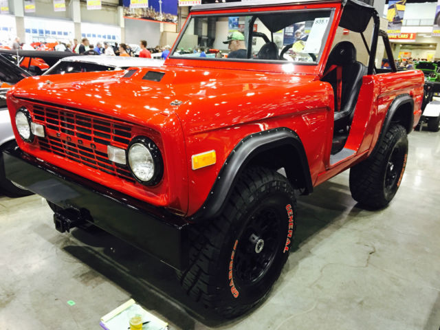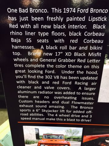 | ONE OF A KIND CUSTOM 1974 FORD BRONCO. COULD BE THE BEST LOOKING AND RUNNING ONE IN EXISTENCE.THE FOLLOWING WORK HAS BEEN COMPLETED IN THE PAST SIX MONTHS :COMPLETE PAINTCOMPLETE NEW FRONT & REAR BRAKES AND LINESFRONT & REAR DIFFERENTIAL REBUILTALL NEW SHOCKSALL GAUGES REPLACED EXCEPT SPEEDOBRAND NEW LIGHTS & BEZELSNEW CARBURETORNEW CERAMIC COATED HEADERSNEW FENDER FLARES WITH SS HARDWARENEW WHEELS & TIRESNEWCORBEAU SEATSNEW RED CORBEAU HARNESSBLACK RHINO LINER FLOORSLARGER ALUMINUM RADIATORFORD RACING AIR CLEANER AND VALVE COVERS |