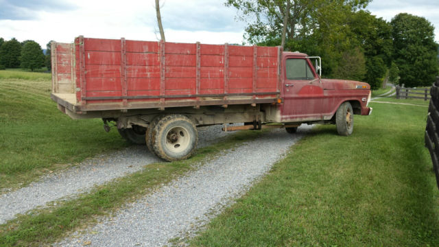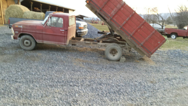 For sale is a Farm used 1968 Ford F-350 dump truck with 12 foot long bed with high rise wooden frames. I purchased the truck as the second owner in 1972 when it had 42,000 miles on it. Currently it has 88,560 miles on it. This truck has been used on a Farm for 43 years and has always delivered. The truck has been stored in the shed away from the harsh elements. Currently it starts up and runs, ut will need some work done to it to get it tip top. It has some trouble pulling really heavy loads (8 tons), ut the hydraulic PTO lift works very well. A 3-4 Ton load is no problem for this classic vehicle. The interior is basically stock and shows the natural wear and tear of a 47 year old vehicle. The body is in fair condition with dents and scratches consistent with its age. The truck has never been involved in any type of accident. This truck has been well cared for and still has life in it. It would be perfect for someone who needs a workhorse at a reasonable price, r for someone interested in collectable cars (restoration). Please email with any questions you may have.