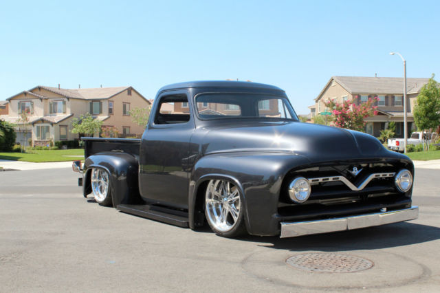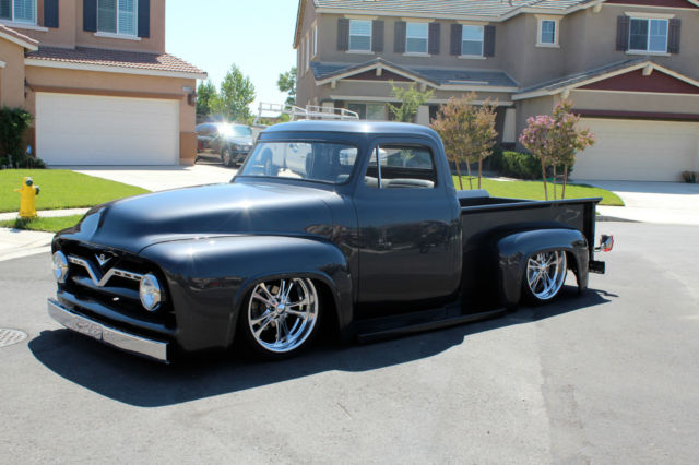 Roof chopped 4", ood sectioned/pie cut 1 1/2", rip rails on roof removed, owl/side vent/door handles smoothed/shaved. Custom bed with custom tailgate, mooth running boards, ilt hood system. C- notched frame powder coated with chrome suspension 4 link and mustang II front end on airbags. Custom dash and gauges, ull custom interior by elegance auto interiors. Full audio/visual system by OB audio. Paint color - "Graphite metallic Luster"By Speed Shop custom paints. Edelbrock performance 350 SB crate with TCi Turbo 350, ord 9" rear end with 3:73 gears. 20" Foose Monterey rims. Old Air AC system. Rarely showed and driven. Minor Scratches inside hood. Gas gauge does not work properly. Youtube -" Paul Porraz 1955 ford F100" to see truck driven. Not hurting for money just moving on to a new project that my wife and future kids can enjoy together.
