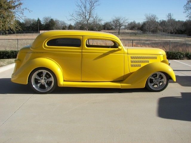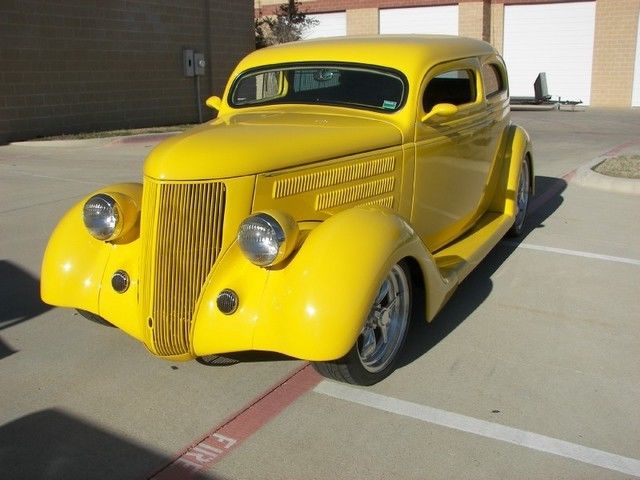 | 1936 Ford Sedan Screaming Yellow Sedan! This is an awesome sedan. Clean and sleek. it has won numerous awards. It sits right and is definitely an eye catcher. With just over 12. 00 miles on it. you could drive it anywhere -- you'll just get there a lot faster than everyone else! Highlights of this Yellow Beauty include: Chopped Top GM 454 V8 Engine GM 700R Automatic Transmission 9" Ford Posi Rear End A/C & Heat Power Windows Remote Entry 17" American Racing Wheels on Front 20" American Racing Wheels on Back Power 4-Wheel Disc Brakes Mustang II Front End Aluminum Coated Headers VDO Gauges Third Brake Light Molded in Body Smoke Tinted Glass Tilt Steering Wheel AM/FM CD Player Don't let this screaming yellow sedan get away. You'll be the star of the weekend cruise nights; the award-winner at local car shows; and the talk of the town! |