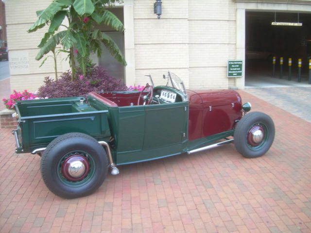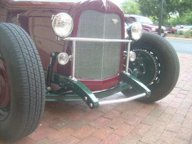 V.I.N.: A1272964 Mileage: 16,112 (Indicated, ince build) About the Car: Overview: You have examined the pictures, ow, lease, ake a couple of minutes to read the details of this amazing seven year long hot rod build. This car was built by the best and most talented people I know. I own a Larry Rathburn built car. I will never part with it. In fact he is building me a beautiful roadster right now. This is an important opportunity for a serious enthusiast. Chassis & Driveline: Custom surface plate, ig-built chassis by Allegheny Speed Shop. Re-contoured 1932 Ford frame rails, icked at the rear. Custom dropped and vee'd front axle with caster adjustable custom chrome radius rods and rear mounted transverse spring. Buick finned aluminum drum brakes. A Frankland Championship quick-change rear axle (open), ith 31 spline Ford axles is mounted on 1947 Ford radius arms modified for adjustments to pinion angle. Aldan coil-over shocks. Front and rear Panhard bars. Custom cowl mounted Volvo steering box with custom made chrome pitman arm, teering arm and drag link. The wheels and hubcaps are 1936 Ford 16s with 195/80 and 215/85 Radials front and rear. Yes, he lettering on the sidewalls was buffed off. The cooling system features a custom aluminum radiator with a unique symmetrical upper tank with inlet and outlets paired at the top. The mechanical fan pulls air through a handmade shroud. Finned alloy overflow tank. Exhaust is through a set of Chevy ram's horns and runs to the rear in beautifully crafted polished stainless pipes with a cutout right in front of each rear tire. Fuel and brake lines are stainless. So are the radiator and heater plumbing and the vacuum lines. Engine & Transmission: Chevrolet 283 C.I.D. V-8, .94 heads, riple Rochester 2 Bbl. carburetors on a rare Edelbrock C355 aluminum intake manifold, delbrock finned aluminum valve covers, olid lifter cam. Chevrolet ignition with a Pertronix electronic conversion. Custom extra capacity oil pan. New GM T-5 Five-speed transmission. Body & Bed: 1929 Ford model A" roadster pickup cab, uilt over a tubular roll-cage cowl structure. This pickup cab has had extensive modification to allow for a low and comfortable seating position, his includes; lengthened doors, ual cowl vents, owered floor pans and bellied rear panel. The chrome vee'd windshield was custom built for this truck and features a special rear view mirror mount and wind wings. Narrowed, eaked, nd vee'd grille shell and custom 3-piece aluminum hood. The pickup bed is shortened and houses a 16 gallon stainless steel fuel tank, hidden tool box and some decent luggage space. Interior & Top: Dark red genuine leather by Kings Upholstery in Roanoke, irginia. Leather trim extends to a console, rm rests, anjo steering wheel and door map pockets. Under dash heater and heated seats. Fully operational windshield wipers. So Cal Speed Shop Auburn style instrument panel with Stewart Warner gauges and an electronic VDO speedometer. Adjustable steering column, eat belts. The folding (or removable) top was constructed from polished stainless Ford deluxe roadster arms and custom ash bows. The fabric is German canvas and the unusual rear window is 1932 Plymouth. Paint & Chrome The paint finishes on this car were applied by Jeff Bennett owner of Wide Open Customs. Jeff is builder of many hot rods and recently was honored as the lead restorer on the historic early custom '39 Ford convertible by Slick Paterson at the Detroit Autorama. The pinstriping was performed by acclaimed automotive artist Tom Van Nortwick. The metal polishing and chrome plating was done by Jeff Hanlon of Hanlon Plating in Richmond, irginia. Do yourself a favor and look these guys up on the internet... About the Builder: Larry Rathburn, wner of Allegheny Speed Shop in Catabwa, irginia, as been building traditional hot rods for decades. Famous award winning builds include his 1929 Victoria Sport Phaeton, ruce Elder's 999 Phaeton, nd the restoration of the 1953 Lincoln Special NASCAR Speedway Division Champ Car. These cars and many others have been featured in Hot Rod, treet Rodder, od & Custom, ar Kulture Deluxe, treetscene, and many more. Show & Go As beautiful and well crafted as many hot rods are, ew drive as nicely as they look. This is not the case with a Rathburn built car. A few months after it's debut at the Detroit Autorama where it won it's class, his car had it's shakedown cruise from the Shenandoah Valley of Virginia to the L.A. Roadster Show. And back. 6,000 miles in all conditions. Out on the road, ood lights, ipers, rakes are not decorative anymore. Sit in this roadster on a cold Colorado morning and enjoy the snug canvas top, eat heaters as well as the working heater while your buddy's shiver in their cars. Rain -X is great stuff on the highway, ut when you are stuck in traffic it sure is nice to have a good set of wipers. Check out the cooling system on this car and you will see a well engineered and very unique approach. Proven in mountains and America's hottest desert. This reliable car gets 18-20 MPG even when driven in "a spirited manner" and has a really decent range with that 16 gallon tank. Please note that because this car has a quick change differential, ike much of the suspension on this car, t can be tuned to suit your own driving style. Additional gears for the quick change will be included in the sale that will allow you to adjust the final drive for greater acceleration or top end performance and economy. You will further note that the speedometer is a programmable VDO unit, o that as quickly as you change the rear drive gears, o can you change your speedometer calibration. Further evidence of the forethought displayed in the building of this car. Study the photos and you will see why Larry Rathburn is considered by his peers to be one of the finest car builders in the country. Documentation: With this car comes a real Virginia title and loads of photos detailing the build. Terms: We invite your personal 