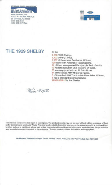 1969 Shelby GT-500 MustangThis largely original car contains:a correct 428- 4V Cobra Jet Ram Air39,250 miles (believe to be original)C-6 AutomaticPower disc brakes, ower Steering, br>Factory Air Conditioning 3:00 traction lock rear end (nodular)correct 428 CJ motor and transmissionSigned by the great Carroll Shelby himself on Glove BoxBeautiful Candy Apple Red paint with Black vinyl high back bucket seatsIt has all the Shelby Snake badges, enter console, ucas fog lights, Roll bar, br>updated Radio in stock mounting and correct Shelby Wheels.This car is in the Shelby World Registry!Underneath the car is unbelievable, verything is new or rebuilt... looks as if it just rolled out of Carroll Shelby's plant.This car has been in the World Renown Jack Miller's Mustang Museum which was the Worlds Largest and Finest Mustang collection in the world!If it was good enough for Jack, would say it would be good enough for anyone.Jack purchased the car from a Barrett Jackson Auction in 2010 but due to health issues he sold his collection.The sellers rated all his cars, ncluding this one, s a number 1 rated car. Prior to Mr Miller purchase, he car has undergone a frame off restoration with correct decals, heck marks and markings, br>Since his purchase of the car it has had less than 50 miles put on it.This car was on the First Season, nd episode of Autogeeks Whats In The Garage.you can google and watch the show. It is a great watch as they interview, wner, ack Miller and show his collection.Reserve price is much lower than Buy it Now pricePlease call with any questions 812-240-0719, f you need to fly in to see, will pick you up at the Indianapolis airport.This item is being advertised locally and I reserve the right to remove.Deposit of $2000 non-refundable due with in 24 hours via PayPal.Balance via Cash or Bank Wire due before vehicle leaves. Payment in full within 5-7 business days
