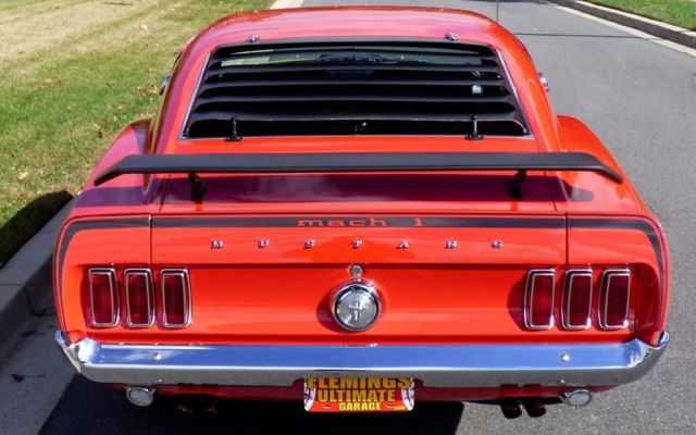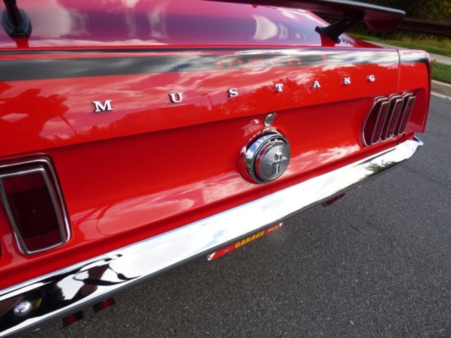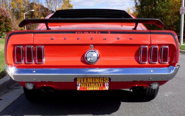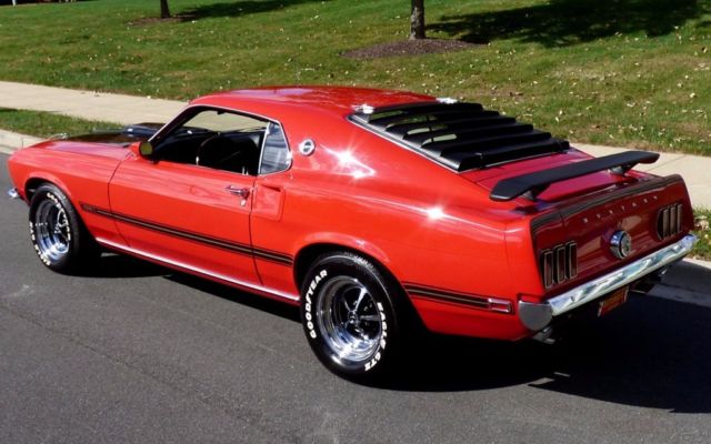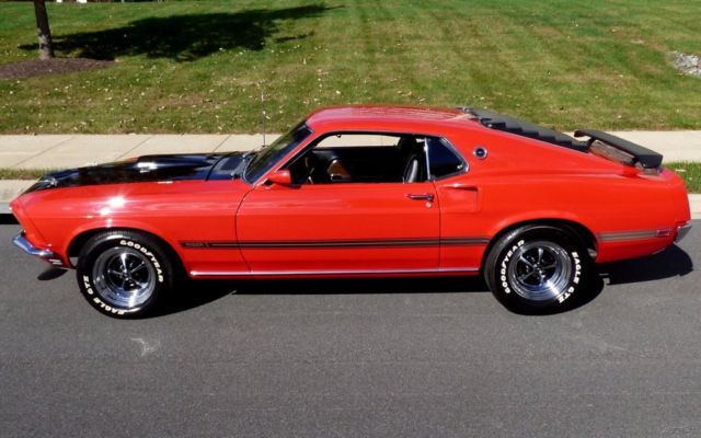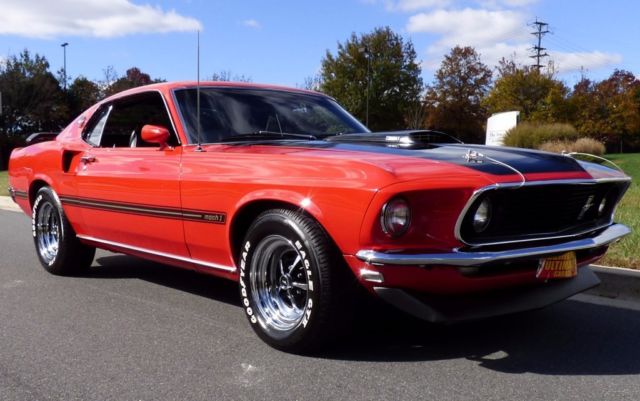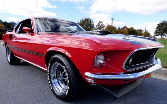 '69 MUSTANG MACH 1, eautifully restored, ighly documented with Marti report, oor tag & buck tag Factory 351cid Windsor V8@290hp Factory HD 4-speed transmission Fords heavy duty 9 rear differential Mirror finish Candy Apple Red paint Correct Mach 1 hood with hood with Blackout treatment & callouts Black bucket seat interior w/factory console & fold down rear seat Magnum 500s w/ Goodyear Eagles Power disc brakes Fast ratio power steering Great sounding free flow dual exhaust Optional Front & rear spoilers Optional rear window louvers This the way to buy one, speed, estored and documented.