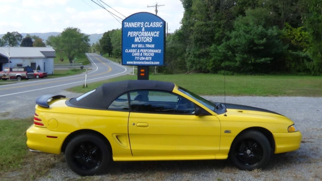1994 Mustang GT convertible. Yellow exterior with black leather interior. PS, B, W, C, utomatic transmission, ach 460 stereo with a Pioneer head unit, ewer top. The car has 92,000 original miles, he transmission was just completely rebuilt. The hood stripes were painted flat black along with the rear spoiler. The interior has some signs of wear but still presents well, he exterior has some chips and small dents but also still presents well. The car runs and drives very good. The AC is cold and everything works. There are no signs of rust, ust repair, r major accidents. The car is 21 years old and is not perfect but is dependable and presentable in its current condition. There were no major modifications done to the car. It does have a Flowmaster cat back exhaust system. I own a small classic car dealership (tanners classic and performance motors) in Carlisle PA. The car is for sale locally so the auction may end at any time.Call LeRoy Tanner with questions 717-254-5075. Delivery is available, lease call for a quote.