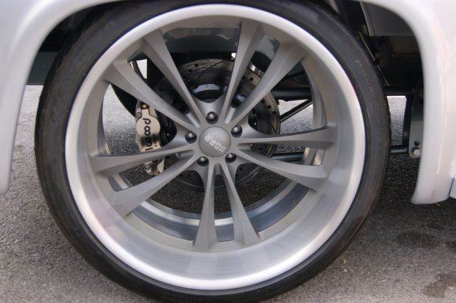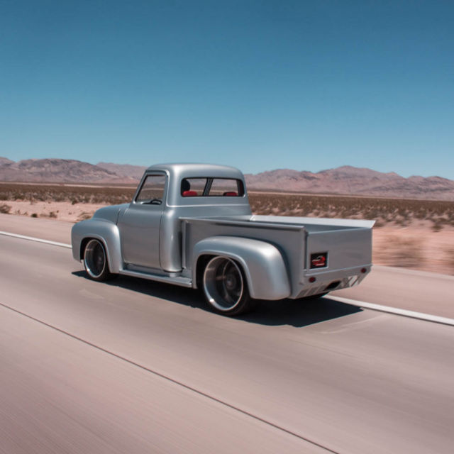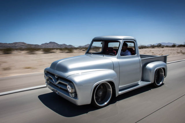 1954 Ford F-100 "Punisher". Pro-built in 2015 with 575 hp/575 ft lb fuel injected Ford Racing Z460 small block crate engine, -speed Tremec manual transmission, urrie 9" 4-link rear end, iding on an NASP "fat tire" 2x4 chassis with IFS, 4" Wilwood disc brakes, 2x12 and 24x15 HRBB wheels, uper wide Pirelli Scorpion tires, teel body and fenders, arrowed running boards, ilt hood, " exhaust with Lamborghini tip, enon headlights, ercedes silver paint, ro-wired, ed leather interior with Glide seat, ut loop carpet, ilt wheel, intage Air, ower windows and locks, emote stereo with subwoofer, n dash I-Pad. Test miles only.