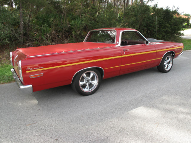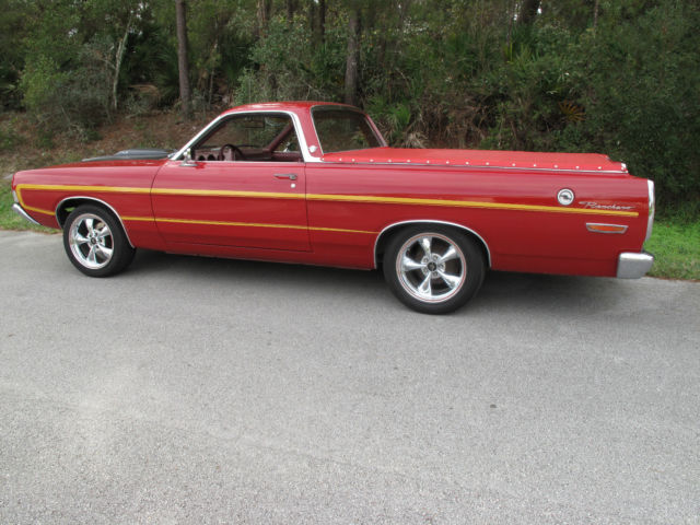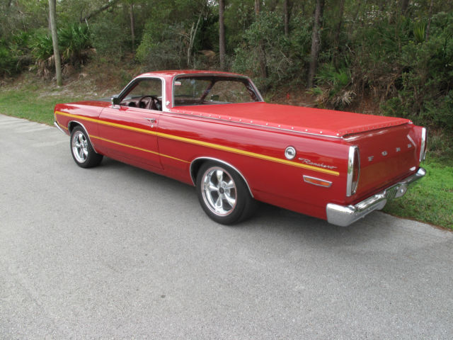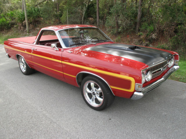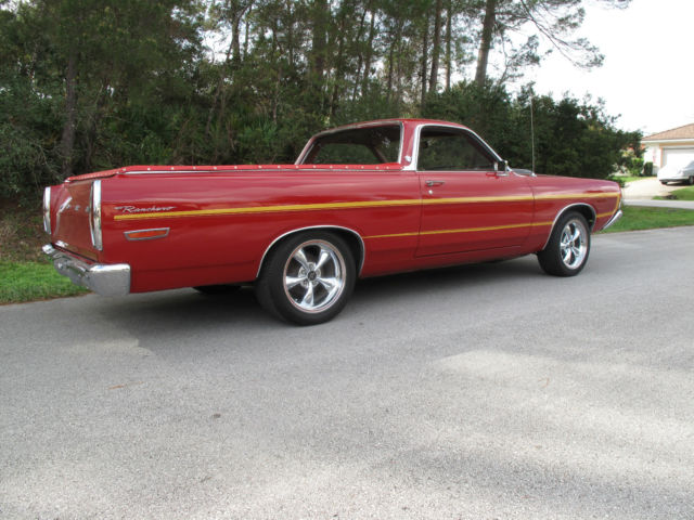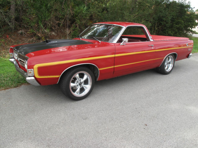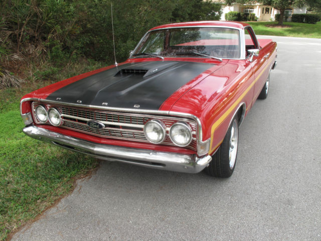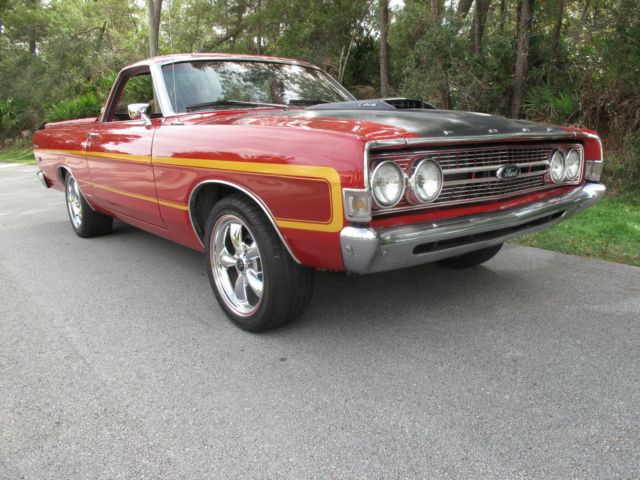 For sale is this excellent condition originally from Arizona Ford Ranchero....Car was a 302 small block but has been converted to a modified FE big block. Absolutely never had any rust, ou can wash the bottom of the floors off and the factory red oxide primer is still there...Has had a re-paint a few years ago but still shows amazingly well with only a few stone chips touched up...Would be proud to take anywhere. Side stripes are reflective Brightwork is very nice. Interior is also very nice and very comfortable with no rips or tears Engine is a 1968 balanced and blueprinted 390 with a 428 crank..Block- Zero decked, RP studs on the mains and heads...Canton windage tray..Probe pistons, agle "H" beam rods, RP bolts, delbrock RPM Aluminum heads 10.8:1 comp. ratio..Erson shaft mounted roller rockers..Crower roller rockers..Crower billet roller cam..Mallory Unilight distributor..Edelbrock water and fuel pump..Long tube headers..Dove dual quad intake manifold with 2 -750 cfm Quik Fuel carbs.. "Cobra" air cleaner, alve covers and oil pan..Howe Racing aluminum radiator Over 500 Horsepower..Runs awesome Tremec TKO 600 manual trans..New custom made driveshaft..McCleod clutch and scattershield..Wilwood clutch master and slave cylinder 9" rear w/Detroit Locker..New leaf springs 1000 miles on drivetrain..Front disc brakes-New master cyl. Front wheels are 17x 8 w/ 235/45/17...Rears are 17x10 w/245/50/17 1000 miles on them Everything functions on this car as it should...Comfortable cruising and wickedly fast |