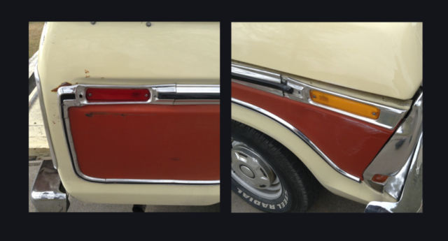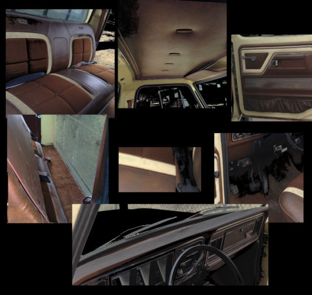 The interior is in very nice condition. The dash is solid with no splits. The seats have been covered most of the life of the truck and are in super shape. There is one split of about 1/8 of an inch on the drivers side of the seat in the cream colored vinyl trim--minor and easily repaired.. There is a close up photo of this split in the ebay photos above. The dash gauges are clear and functioning. The entire inside is still richly colored and in super shape.There is fading on the carpet, ut the carpet is still in good condition.There is a smallloss ofwood grain trim on the steering wheel from wear. You can see iton the outside edge of theleft speed control button in theabove photo of thesteering wheel. All the glass is good. All the lighting works from the dash and interior to the backup lights.