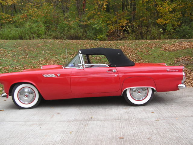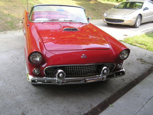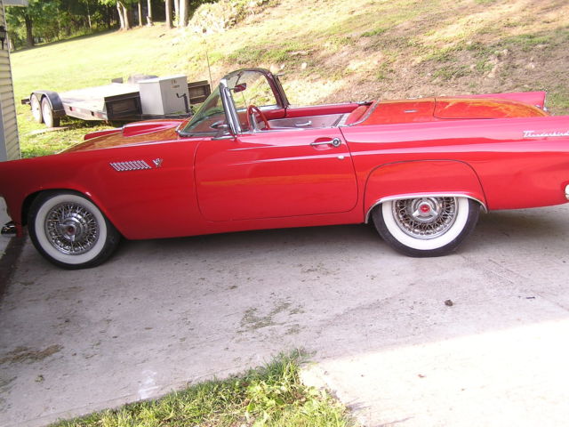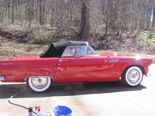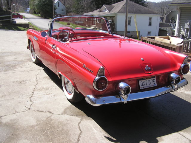 Due to health problems, I am selling my 1955 Ford Thunderbird. The car is essentially original, still with the factory 6 volt system. The only non original fixture on the car involves the addition of 1956 Thunderbird wing windows which seem better for air flow with the top down. The dash is nice and all gauges work fine, even the clock. The original 6 volt AM radio is in place but inoperative. The car starts and runs fine. The transmission shifts as it should and the entire drive train is in good shape. The vehicle is equipped with power seats and power steering. A new power seat adjustment motor has just been installed, along with a new Holly carburetor, shocks, exhaust (mufflers), new tune up with plugs, points, condenser, wires, etc., new 6.70 X 15 Coker classic tires, original wheels, and full cover caps, plus a new inspection sticker. A set of 5 wire wheels with spinners (need refurbishing) go with the sale as do extra tires and the car cover. The seats, door and kick panels are in good condition. Likewise for the new Thunderbird floor mats. The brakes are fine and the vacuum system is good. The wipers are slow; not unusual for vacuum wipers. Both the soft top and hard top (1955 with no port hole) are in excellent shape, essentially like new. All chrome is in very nice shape. The repaint is 11 to 12 years old and shows very well. There are a few small paint blisters but nothing serious and can hardly be noticed. The trunk is fine but rather unremarkable. The underbelly and frame of the car are clean. Overall, this is a nice vehicle not without minor concerns such as replacing the horn ring and rebuilding the vacuum motor/pump. No dents, bangs, rips, or tears. Inspections welcome. I will require $1,000 down to Paypal with the remainder in the form of a certified bank check or cash when the vehicle is picked up. I'm in Belington, WV, home phone 304-823-1992 and cell number 304-614-8348. Bob