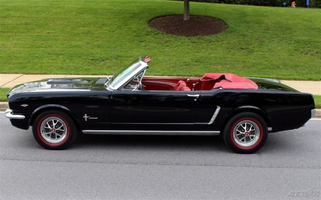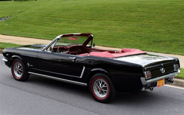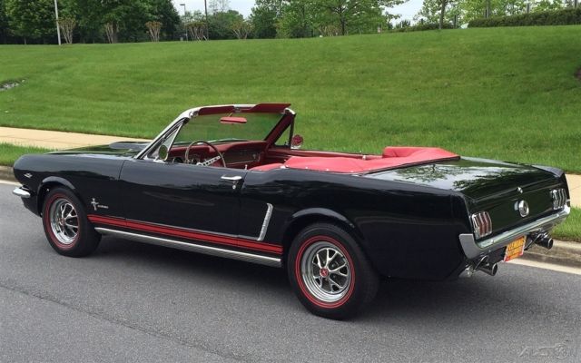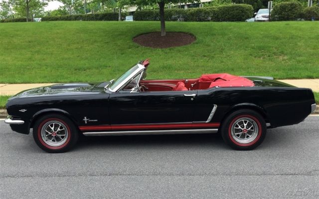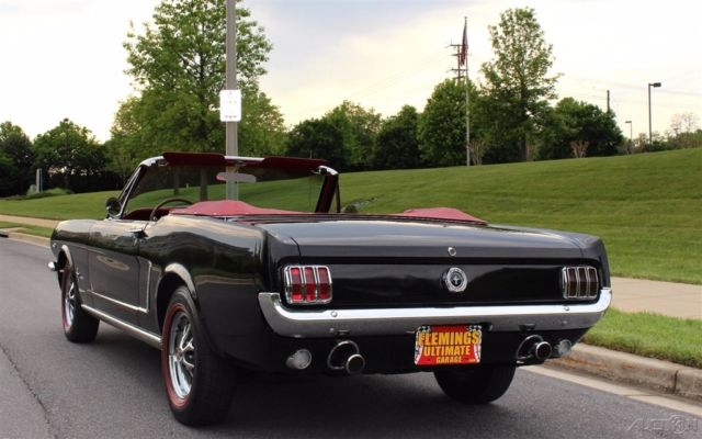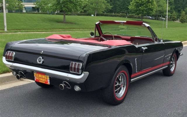 Spectacular, no expense spared, restoration of this pony car with color match hardtop Ford 289cid A-code V8 w/ 4bbl @ 225hp, Optional 4-speed manual transmission, Original HD rear differential w/ 3.50 gears, Mirror finish Raven Black paint with color match Hardtop show waxed an detailed, Great looking Red bucket seat interior with full factory console + woodgrain trim, Optional full array of Rally-pak gauges including 6K RPM Tach and Clock, Upgraded Retrosound AM/FM digital sound, Optional Fast-ratio power steering, Optional Disc Braking system, All new chrome + stainless trim, Show ready detailed engine compartment, Period correct wheels w/ double redline tires, Great sound dual exhaust w/ GT tips, Original A-code and the top goes down too! Show or drive this spectacular 66 Mustang