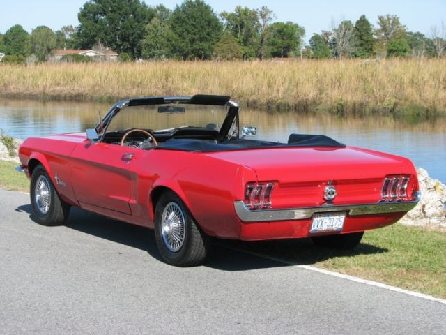 This is a classic 1968 Mustang Convertible with red exterior, black vinyl interior and a black vinyl top. It has a completely rebuilt 200 cu / 3.3L inline 6 cylinder rebuilt engine and re-manufactured automatic transmission. If you are looking for your next winter project here "she" is ready to drive into your shop and start your rebuild (her name is Lucy). Be sure to review all photos and descriptions and ask any questions before you bid. Lucy looks good from 20 feet however she does need paint and body work and the undercarriage needs serious work to remove rust and prevent further decay. Summary below provides the good, the not so good and the ugly: The Good: Lucy's like-new Michelin radial tires, new fuel tank, very good front and rear chrome bumpers, rebuilt engine with new crankshaft and rod bearings, new cam bearings, new valves, new push rods, new pistons, new connecting rods, new seals, new gaskets, heads and valve seats resurfaced/re-seated, new brake lines and brakes refurbished. Newly re-manufactured automatic transmission (Jennings). Very good black vinyl seats and black carpet. Good black vinyl boot cover. New fuel tank and new brake lines. Drives good, transmission shifts fine, engine runs fairly good and always turns heads (a good 20 footer). The not so good: Lucy's red paint looks good from 20 feet but is definitely showing her age. I don't know for sure but I guess she was painted about 8 years ago and she now has paint cracks, small scratches, minor dents and dings, dented rear lower valence, rust bubble on right door corner, heavy bondo and unmatched paint on lower 4 inch rear section of front right fender, dent and paint damage on hood and generally in need of paint refinishing. Fuel gage needs to be recalibrated (shows 1/2 tank at full). Lucy purred like a kitten until this spring. Now she is hard to start and runs a bit ragged at times. The carburetor has been rebuilt however she still idles a bit ragged. I recommend adding a Pertronix Ignitor to the distributor to provide a more reliable spark control. The ugly: Lucy is suffering from rust and decay in several areas of the undercarriage. Most of the decay is in auxiliary body panels under the undercarriage such as below the floor pans. A few areas may need major repair in order to stop the rust and prevent further decay. Some areas may lead to structural failure if not properly attended to (front frame rails may need replacement or welding on additional support plates). On Jul-26-16 at 16:54:37 PDT, seller added the following information: Forgot to mention: The driver's door apparently has been replaced with a 1967 door. The data tag is 7T01C08759. Also if you have any questions please submit ASAP to ensure they get answered in plenty of time.