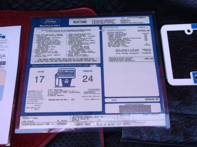 | Car is all original and in beautiful condition. Top and tiresreplaced 2016 though top was still in good shape. Runs very well and the clutch and trans are very smooth. A dashboard cover goes with car as well as the original floor mats. This car was built for a Ford exec and cost $20k in 1991. |
