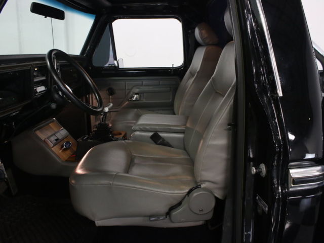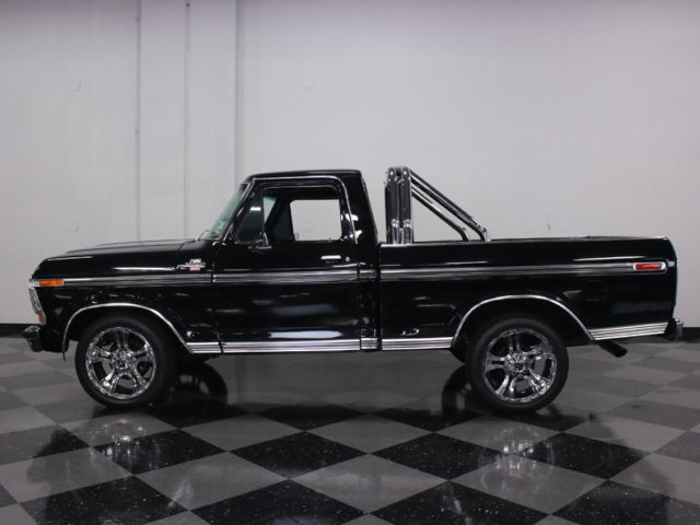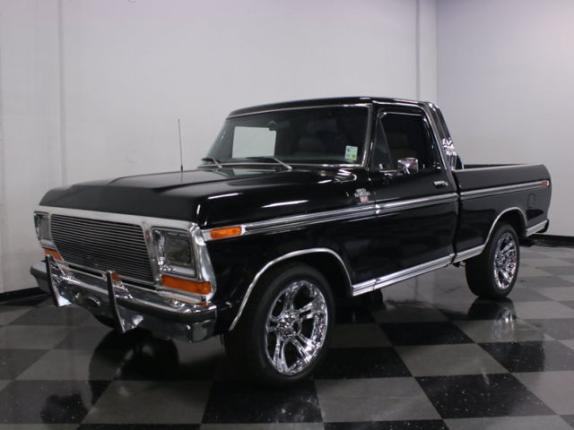 Incredibly over-built and filled with both performance and comfort-enhancing upgrades, this 1978 Ford F100 pickup is a no-compromises build with a 460 big block, a fresh transmission, and tons of options, all wrapped in a fantastic black short bed/regular cab body. Is this the ultimate '70s Ford pickup?The Ranger XLT is iconic these days, and if you were around in the '70s, you got used to seeing a lot of these on the road. Today, however, finding one that hasn't been worked back into the ground is challenging. Some survived by virtue of simply being cool, and this one, perhaps because it's black with a big block, managed to get stashed away instead of put out to pasture. The paint is more recent, of course, and looks great on the chiseled bodywork and it shows off just how straight the sheet metal really is. There are a few updates that give it a unique look starting with smoked headlight covers and LED taillights, a custom grille, that chrome roll bar in the bed, and tinted windows. For practicality, the bed has been treated to a spray-in bedliner, and there's plenty of brightwork on the body to break up all that inky black paint. Gray buckets from a late-model have been stuffed into the cab and it gives this truck a whole new lease on life. Instead of looking like '70s working class, it's 21st century first class and includes a host of trick modifications. The most notable is the custom-made center console, which not only houses the trick Hurst shifter for the brand new C6 3-speed automatic transmission, but also a pair of cup holders and an Alpine CD changer, all faced in genuine wood that warms up the interior. Then there's the instrument panel, which uses digital gauges hidden behind a tinted Plexiglas screen to give it a totally smooth look when the power's off and a magical light show when you turn the key. A leather-rimmed steering wheel adds some elegance to the already nicely appointed interior, and A/C, power windows, and an AM/FM/CD/Bluetooth head unit in the dash make it feel like a much younger truck. The engine is a beautifully detailed 460 cubic inch big block that looks great and runs even better. Holley Pro-Jection fuel injection was hidden under the stock air cleaner for a very subtle look, and it runs better than any carburetor you've ever driven. The block itself was painted Ford Blue and topped with chrome Motorsport valve covers that work well with the stock air cleaner assembly. The A/C system was upgraded to R134a refrigerant, and with power steering and brakes, it's easy to forget you're driving a vintage pickup. A big aluminum radiator with electric fan keeps temperatures under control and a great-sounding dual exhaust offers chrome tips peeking out from under the rear quarters. There are 3.00 gears in the 9-inch rear end, so this truck is effortless on the highway, especially with all that big block torque on tap. And the stance is exactly right, with the big wheel arches filled with equally large 20-inch chrome alloys wearing 275/45/20 performance radials.Not many trucks get this kind of makeover so late in life, but they really seem to have spared no expense to make this Ford truly spectacular. Call today! |
