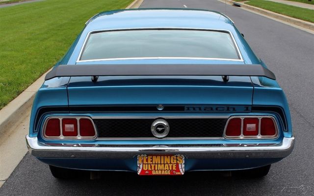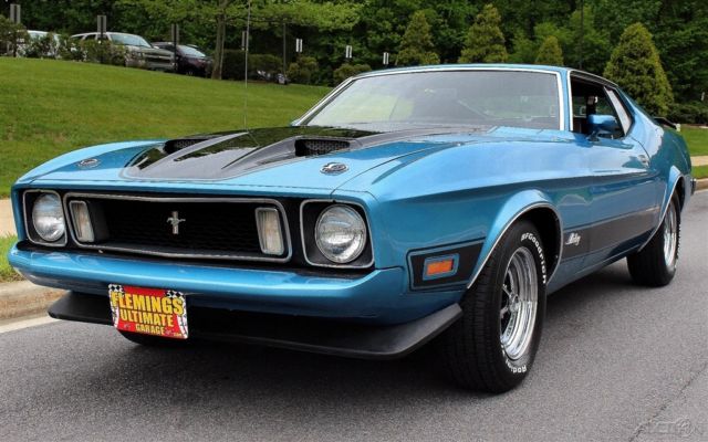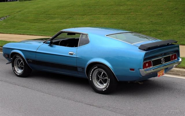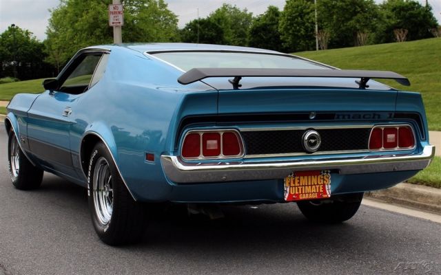 73 MUSTANG MACH 1 COBRAJET Spectacular, no expense spared, restoration + last year for Cobra Jet Cleveland V-8 in the Mustang! Original Ford 351cid CobraJet V8 @ 266hp, Original Top loader 4-speed close ratio manual transmission, Original Ford 9 HD rear diff w/ 3.50 gears, Mirror finished Grabber Blue paint with full Mach 1 stripes&callouts,show waxed+detailed, Great looking Black bucket seat interior w/ full factory console and working clock! Optional fold down, Sport deck rear seats, Full factory gauges including 8K RPM Tach, 120mph speedo, Oil, Alt, Temp, and Fuel, Period correct Rim-blow steering wheel, Optional Power Disc Brakes, Optional Fast-ratio power steering, Show ready detailed engine compartment, Optional Magnum 500s w/ BFG Radial T/As, Great sounding dual exhaust system, Full Marti Report and same family owned for the first 42 years of its life!! Show or drive this collector quality last year real 73 Mustang Mach 1.