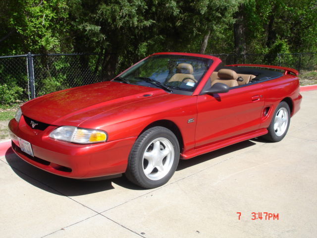 | Vehicle is a one owner car, adult female driven, non-smoker. Vehicle has been garage kept. Interior, top, leather seats spotless. No tears. No carpet worn. Like new. Car has factory GT trim. AM-FM Cassett radio with factory CD player. Car also has Ford Accessories, car cover, tuneau cover and slosh mats. |