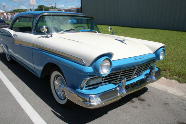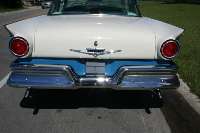 You are looking at a beautiful Fairlane 500 2dr Hardtop. The color is Dresden Blue over White, and the interior is also blue and white. The engine is the T-Bird 312 with a four barrel carb and automatic trans. It has factory power steering and power brakes, and the original radio was converted to FM. It rides on four new wide whitewall radial tires, and the spare tire is also a wide whitewall radial. It has fender skirts, the original jack and also a car cover. This Ford is a real head tuner and runs and handles great. I am selling it as is with no warranties or guarantees implied. I also retain the right to end listing early because it is advertised locally for sale. Please do your homework before bidding, and if you wish you can get it inspected at your cost. I will be more than happy to show the car. If you need more info please contact me thru Ebay. I will include free shipping within the USA if sold at the reserve price.Thank you, and good luck on your bidding.