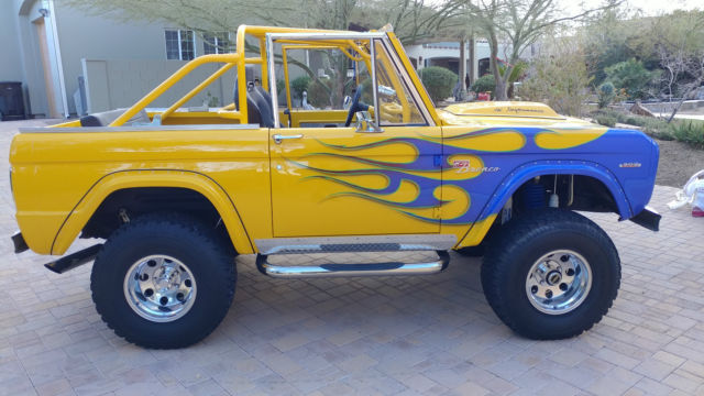 This is a beautiful restored 1969 Bronco. It has a 302 v8 that has been custom built with Canfield heads, mild cam, ceramic headers, aluminum intake, 650 PRO VAC carburetor, MSD high performance ignition, aluminum radiator and dual exhaust with flow masters. It is matched with an Advanced Adapters NV3550 5 speed manual transmission and a rebuilt transfer case. The suspension is James Duff 3.5 lift with 4 shocks per axle. It is fitted with Wild Horse power brake booster, front disc brakes and Warn hubs. The interior has diamond plated inserts, leather buckets sport seats, rear bench seat, lockable console, roll bar, duel gas tanks and just look at the chrome gages that sit above the instrument panel. The paint is a show stopper! It is absolutely gorgeous done in bright yellow with blue flames. It has diamond plate rockers, nurf bars, hood scoop and fender flairs and is it comes with both a full top and bikini top. The list goes on and on andit even comes with the original owner’s manual, sales brochure and a notebook full of restoration facts. Its fun to drive and scary fast too. You won’t be disappointed.I can assist with shipping if needed. |